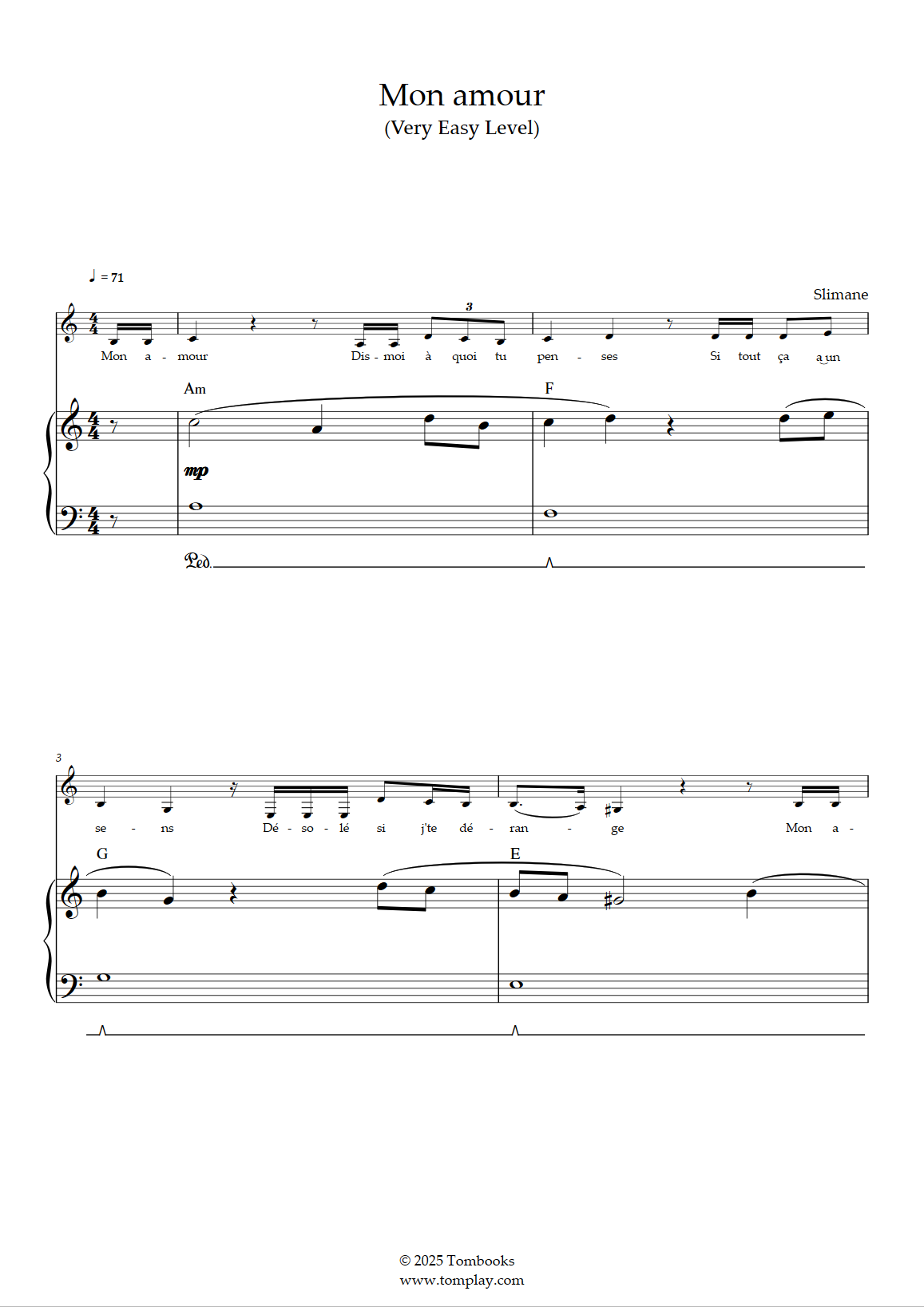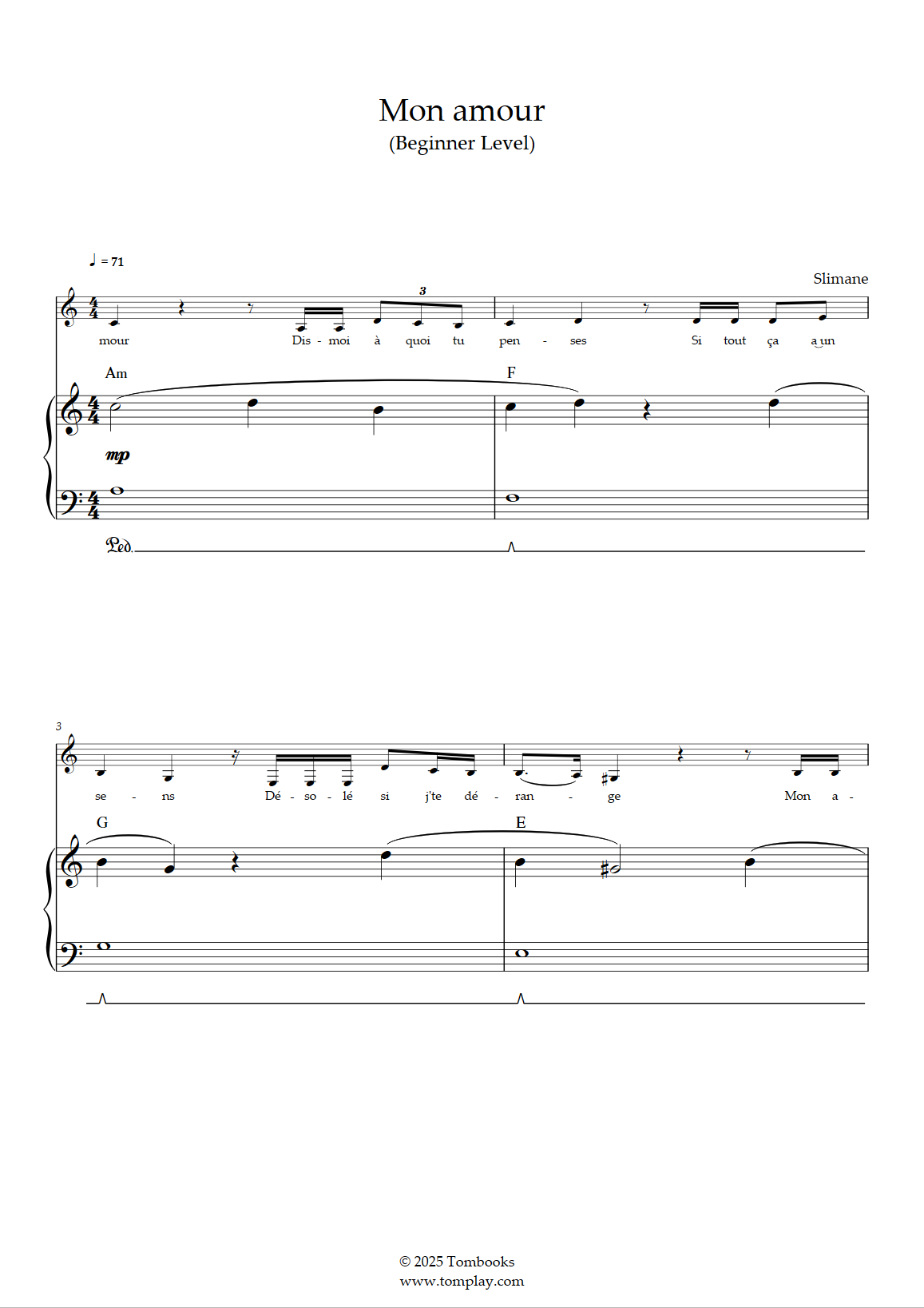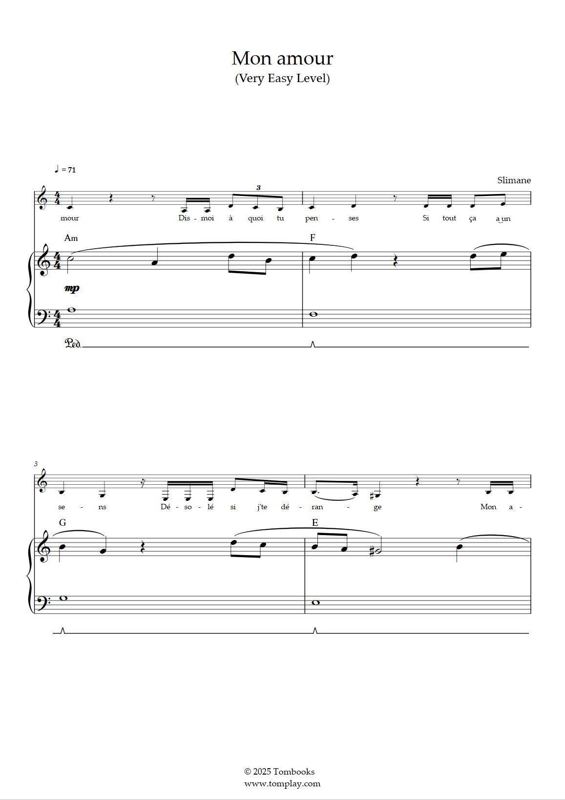 Téléchargez la partition Piano Mon amour (niveau facile/intermédiaire, piano solo) de Slim…