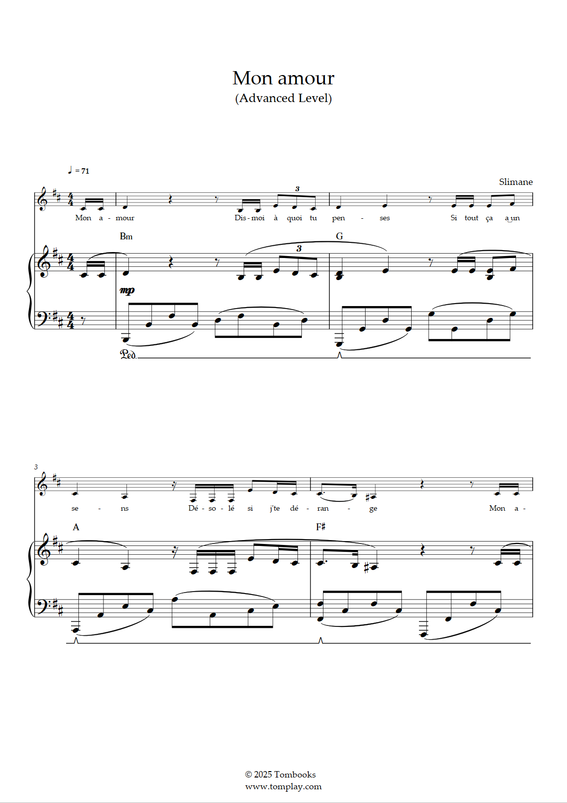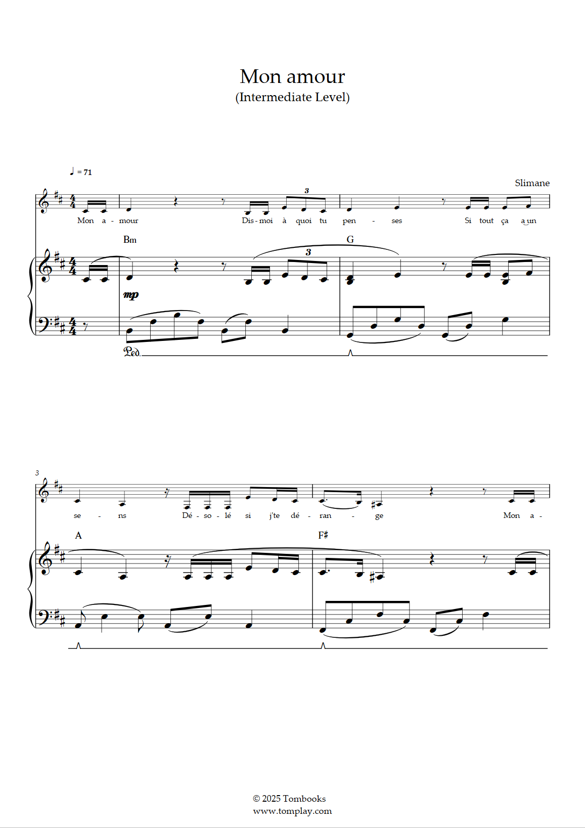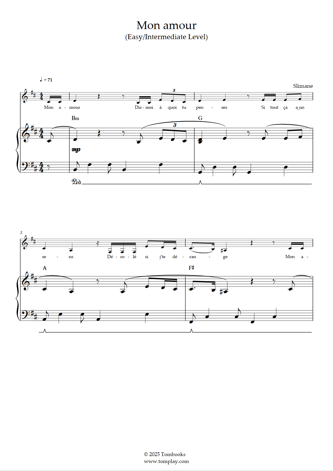 Téléchargez la partition Piano Mon amour (niveau facile/intermédiaire, piano solo) de Slim…