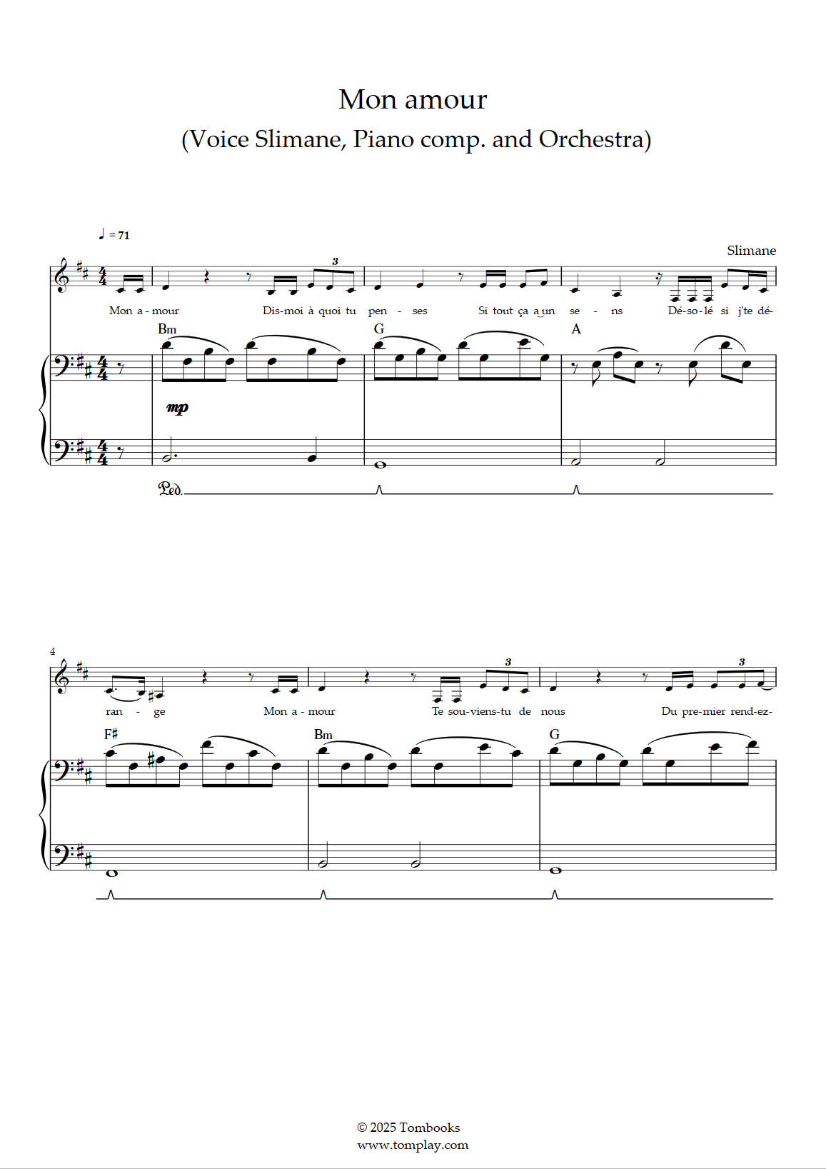 Téléchargez la partition Piano Mon amour (voix Slimane, acc. piano et orchestre) de Sliman…