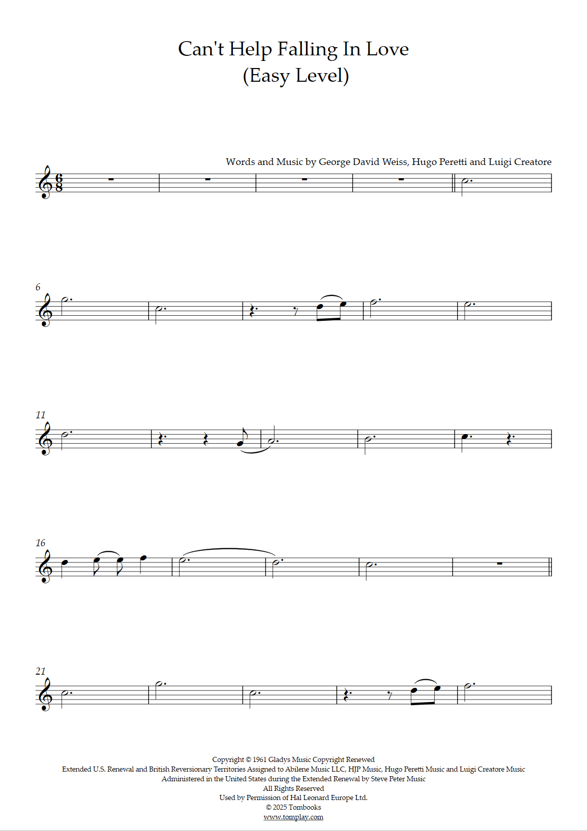 Téléchargez la partition Flûte à bec Can't Help Falling In Love (niveau facile, flûte à be…