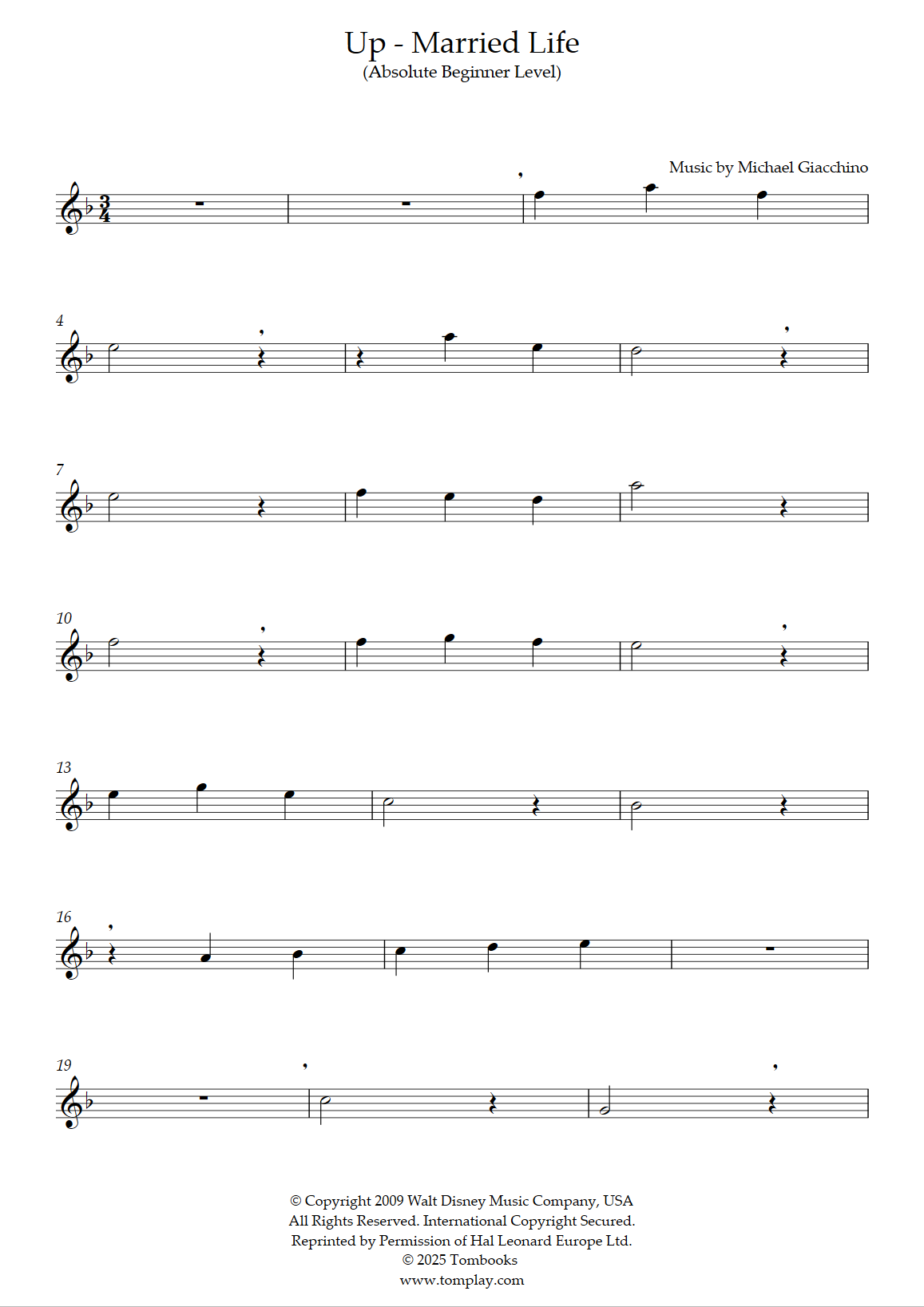 Téléchargez la partition Flûte Là-haut - Married Life (niveau débutant absolu) de Michael …