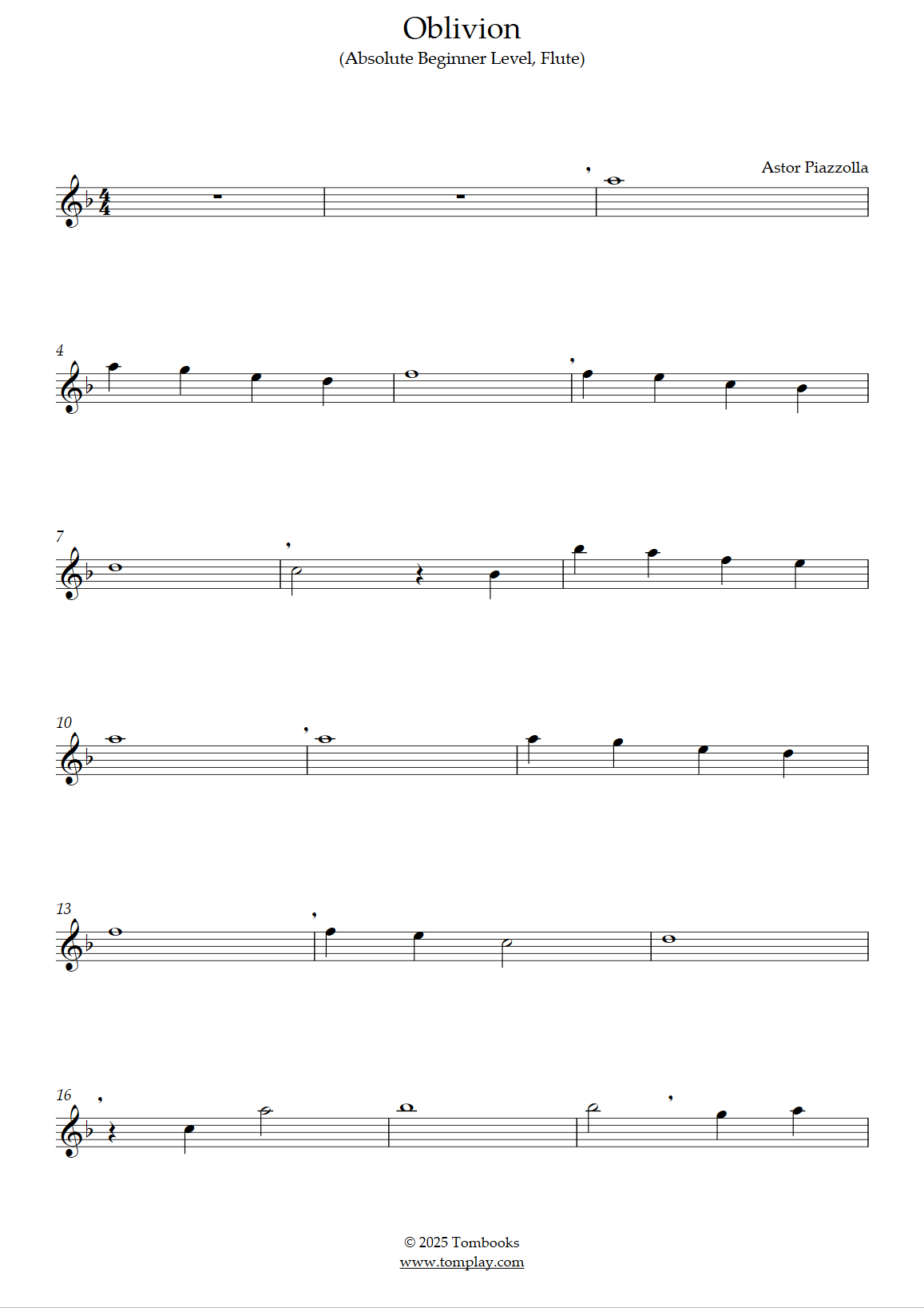 Téléchargez la partition Flûte Oblivion (niveau débutant absolu) de Astor Piazzolla. Parti…