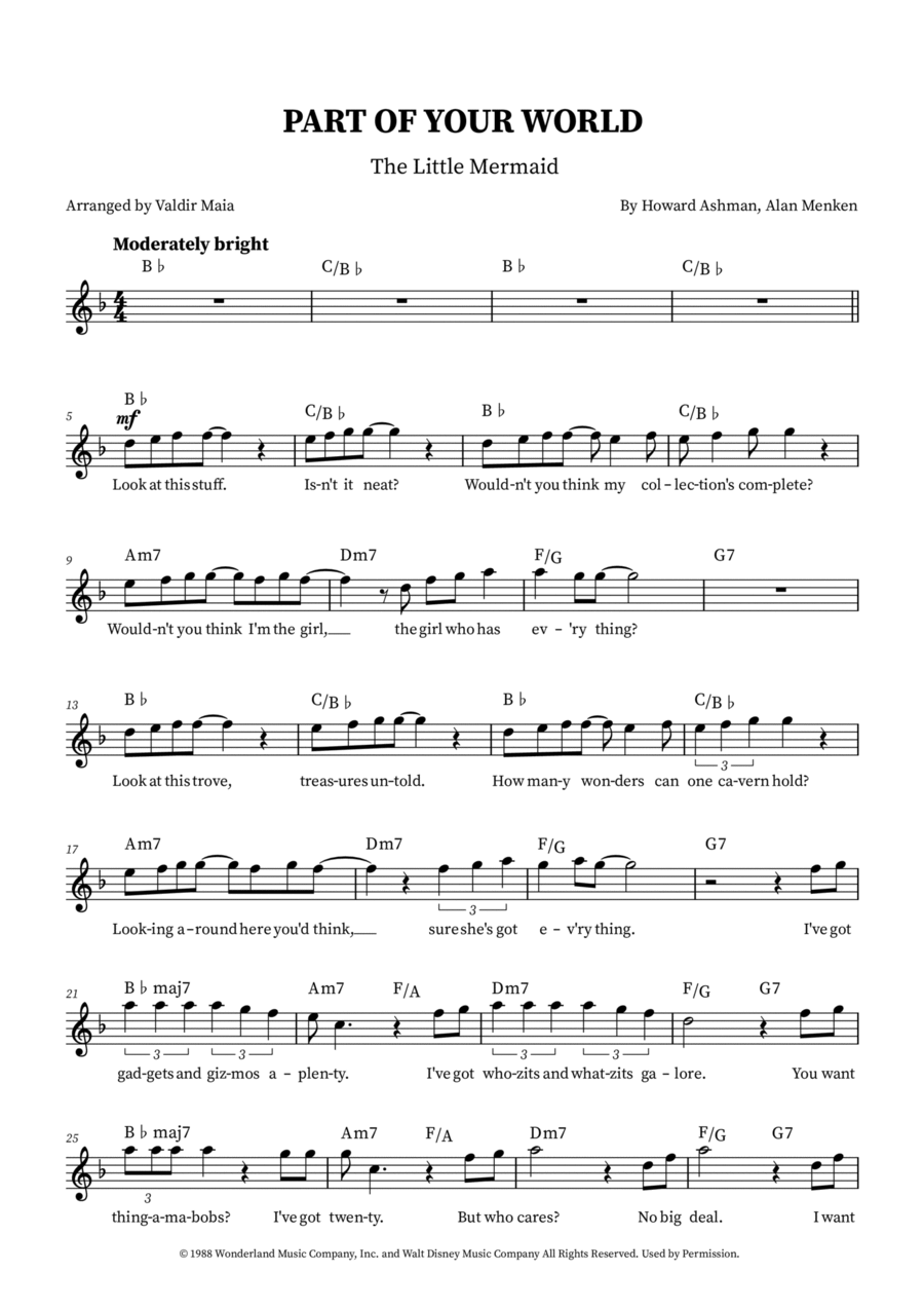 C Instrument - Level 1 - Digital Download SKU: A0.1241978 Composed by Alan Menken and Howard Ashman. Arranged by Valdir Maia. Broadway,Children,Film/TV,Musical/Show,Pop,Singer/Songwriter. Lead Sheet / Fake Book. 3 pages. Valdir Maia #837336. Published by Valdir Maia (A0.1241978). Part Of Your World, from the Little Mermaid new movie in an arrangement for solo instrument with CHORDS in the key of:A, Ab, B, Bb, C (lower), C, D (Lower), D, E (lower), E, Eb (lower), Eb, F (lower), F, GTo see other arrangements, check out my selling page and follow me at www.youtube.com/@easysheetmusic.