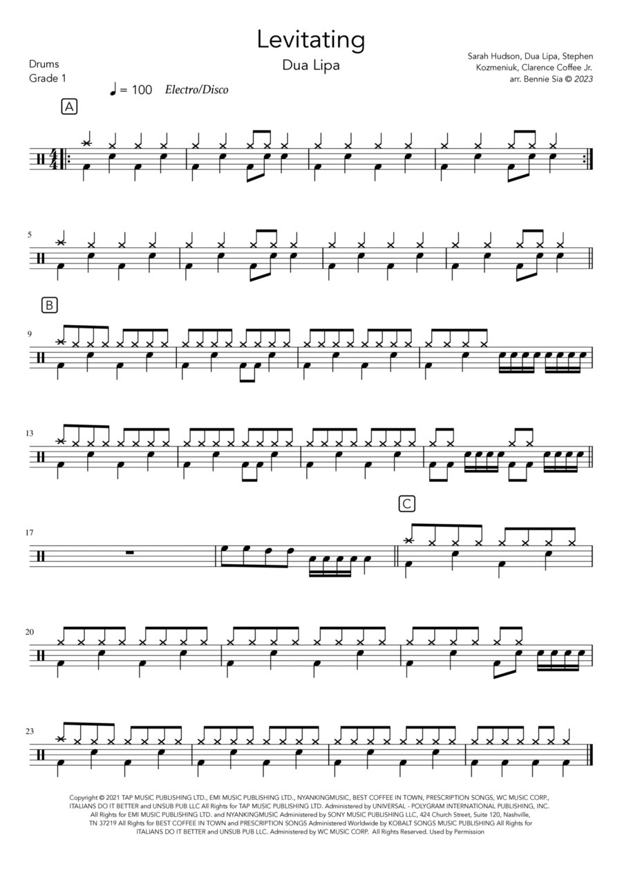 Drums - Level 1 - Digital Download SKU: A0.1425556 By Dua Lipa. By Clarence Coffee Jr., Dua Lipa, Sarah Hudson, and Stephen Kozmeniuk. Arranged by Bennie Sia. Pop. Score. 1 pages. Bennie Sia #1006368. Published by Bennie Sia (A0.1425556). Levitating, Dua Lipa (beginner version)arranged by Bennie Siadesigned for Drums Grade 1 skillsets.