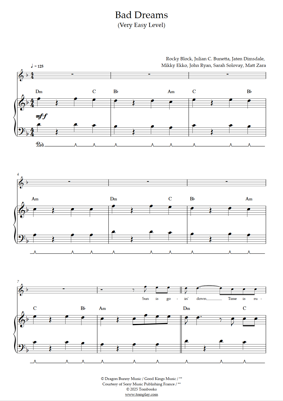 Téléchargez la partition Piano Bad Dreams (niveau très facile, piano solo) de Teddy Swims.…