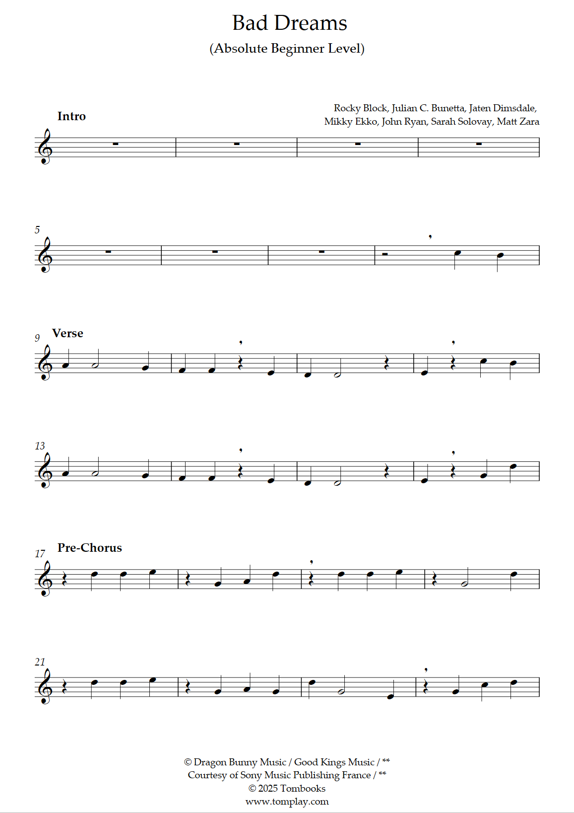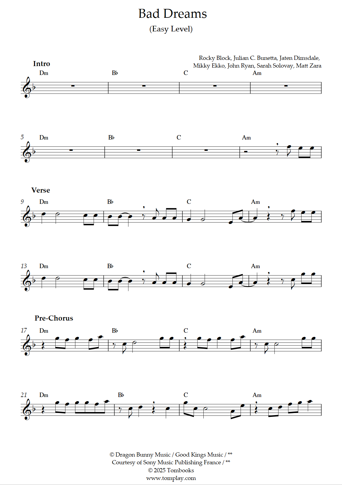 Téléchargez la partition Saxophone Bad Dreams (niveau très facile, sax soprano) de Teddy S…