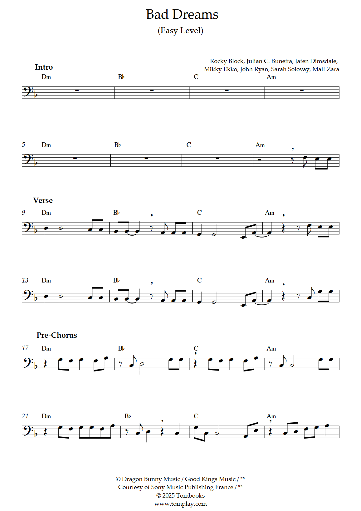 Téléchargez la partition Saxophone Bad Dreams (niveau débutant absolu, sax ténor) de Teddy…
