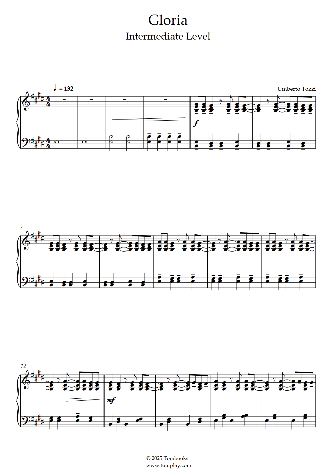 Téléchargez la partition Piano Gloria (niveau facile, piano solo) de Umberto Tozzi. Part…