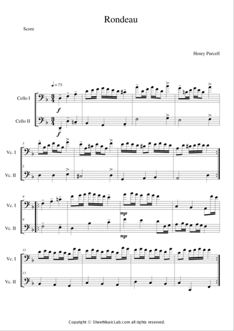 Cello Duet Cello - Level 3 - Digital Download SKU: A0.587663 Composed by Henry Purcell. Arranged by David McKeown. Baroque,Concert,Instructional,Standards,Wedding. Score. 3 pages. David McKeown #4729521. Published by David McKeown (A0.587663). The Trumpet Tune and Air was in fact written for organ, with the melody played on thetrumpet stop. Written around 1700, for many years this piece was attributed to Henry Purcell. But more recently many have questioned whether the composer was in fact Jeremiah Clarke, organist at St Paul’s Cathedral. What is known is that the piece was written for a semi-opera called The Island Princess, and that both men contributed music to the production. In recent years this piece has become a popular wedding favourite. This full version is arranged as a duet for two Cellos and the performance time is around two and a half minutes. Of course, performers, especially at weddings, may wish to abridge and shorten the arrangement. This is easily done as the different sections are self-contained and the repeat may be ignored. The short sample here and the full length version on the youtube link are from the Clarinet and Alto Saxophone version of this arrangement.Musicians at an intermediate level and above will find this ideal for formal and informal performances. There are of course separate piano and instrumental parts included in downloaded the file.Teachers will enjoy using this arrangement as a fun way to help with strict time, full tone and dynamic contrast. There are many more top quality arrangements and compositions by David McKeown for you to browse at http://www.sheetmusicplus.com/publishers/david-mckeown/6203