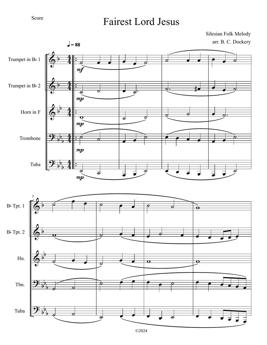Brass Quintet Horn,Trombone,Trumpet,Tuba - Level 3 - Digital Download SKU: A0.1470010 Composed by Traditional. Arranged by B. C. Dockery. Christian,Easter,Religious,Sacred,Traditional. 7 pages. Ben Dockery #1047757. Published by Ben Dockery (A0.1470010). Arranged for brass quintet: two B-flat trumpets, french horn, trombone, and tuba. Great for recitals, lessons, preludes, offertories, and postludes. Intermediate level. Includes score and parts.