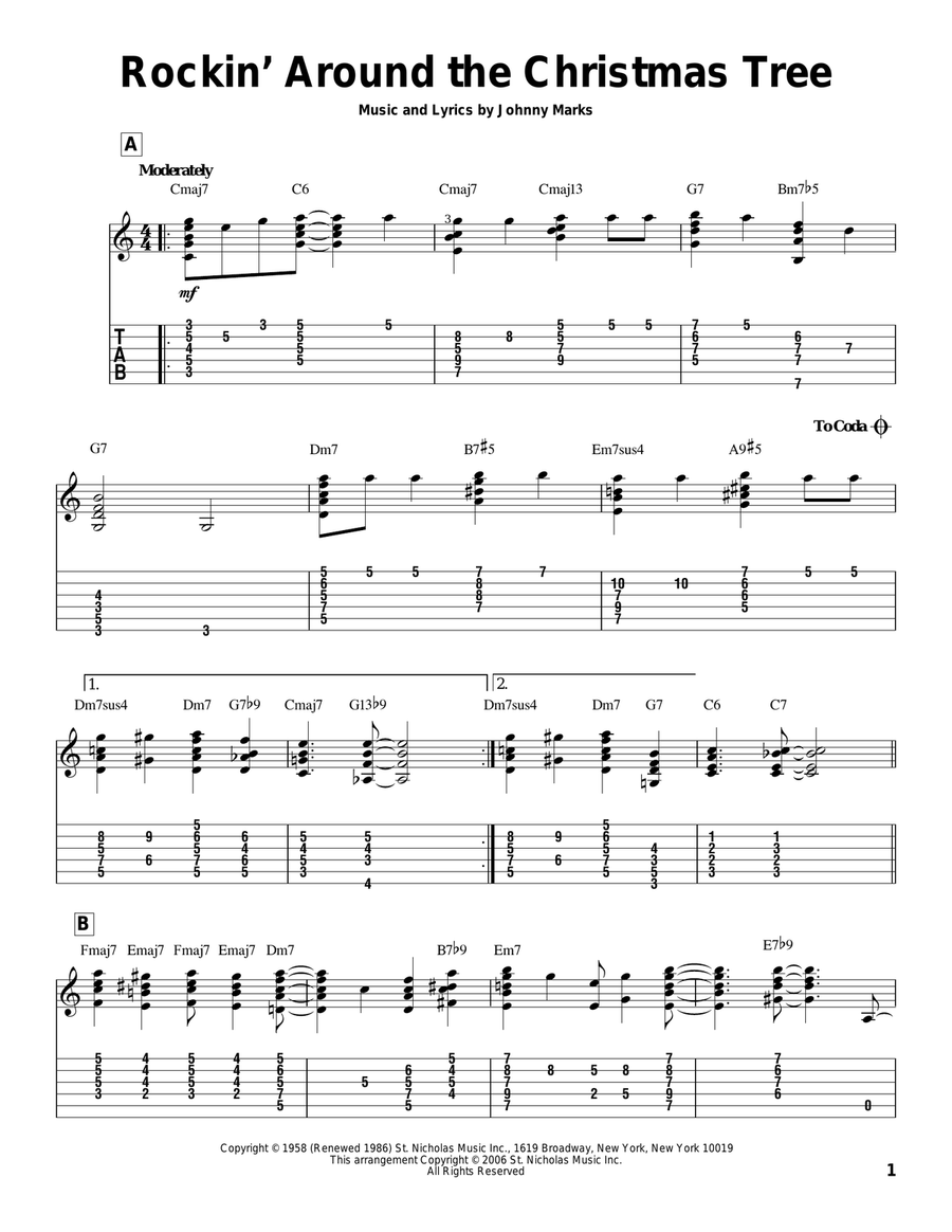 Guitar - Level 1 - Digital Download SKU: A0.1078018 By LeAnn Rimes. By Johnny Marks. Arranged by Calum Wood. Christmas,Rock. Guitar Tab. 2 pages. Calum Wood #682222. Published by Calum Wood (A0.1078018). Introducing Rockin' Around the Christmas Tree, a classic holiday tune that's sure to get you in the festive spirit. Now available in a beginner-friendly guitar arrangement with TAB and music notation, our version of the song even includes lyrics on the second page.Originally recorded by Brenda Lee in 1958, Rockin' Around the Christmas Tree has since become a staple of holiday playlists everywhere. Its catchy melody and upbeat tempo make it the perfect tune for dancing, singing, and spreading holiday cheer.Now, you too can learn to play Rockin' Around the Christmas Tree on guitar with our easy-to-follow TAB and notation. Our arrangement is designed specifically for beginners, making it simple to learn the song's iconic riffs and memorable melody.Whether you're a fan of classic Christmas music or simply love great guitar music, Rockin' Around the Christmas Tree is the perfect addition to your holiday repertoire. Imagine impressing your friends and family with your rendition of this festive tune at your next gathering or strumming it out on your own for pure enjoyment.So what are you waiting for? Order your copy of Rockin' Around the Christmas Tree for guitar today and get ready to rock around the tree this holiday season.