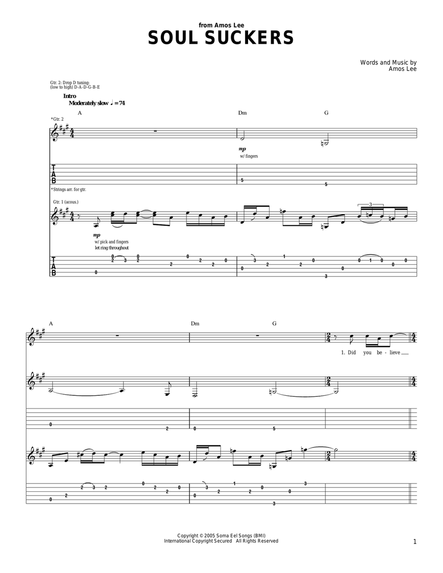 Soul Suckers Sheet Music by Amos Lee - Guitar Recorded Versions (with TAB), Guitar TAB Transcription/Guitar Recorded Versions (with TAB);Guitar TAB Transcription