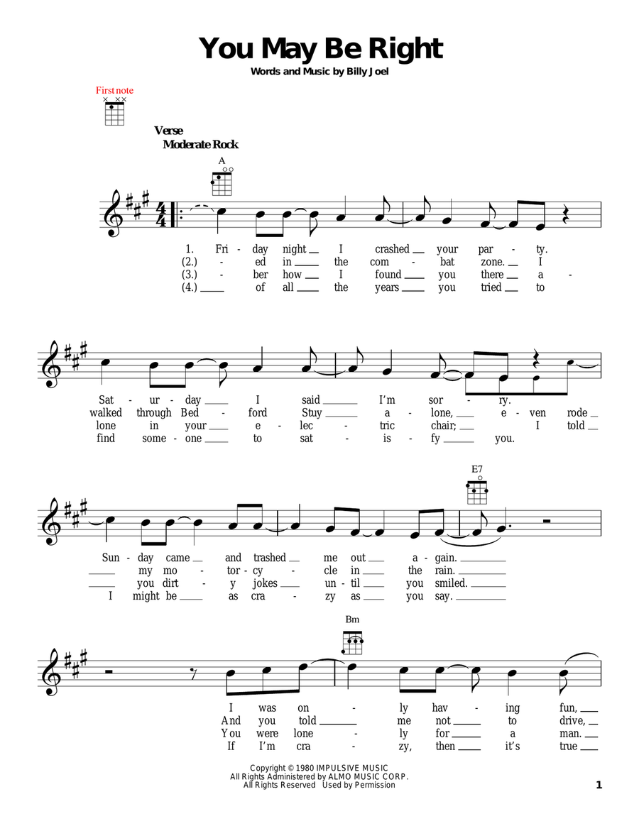 Billy Joel: You May Be Right sheet music to print instantly for ukulele