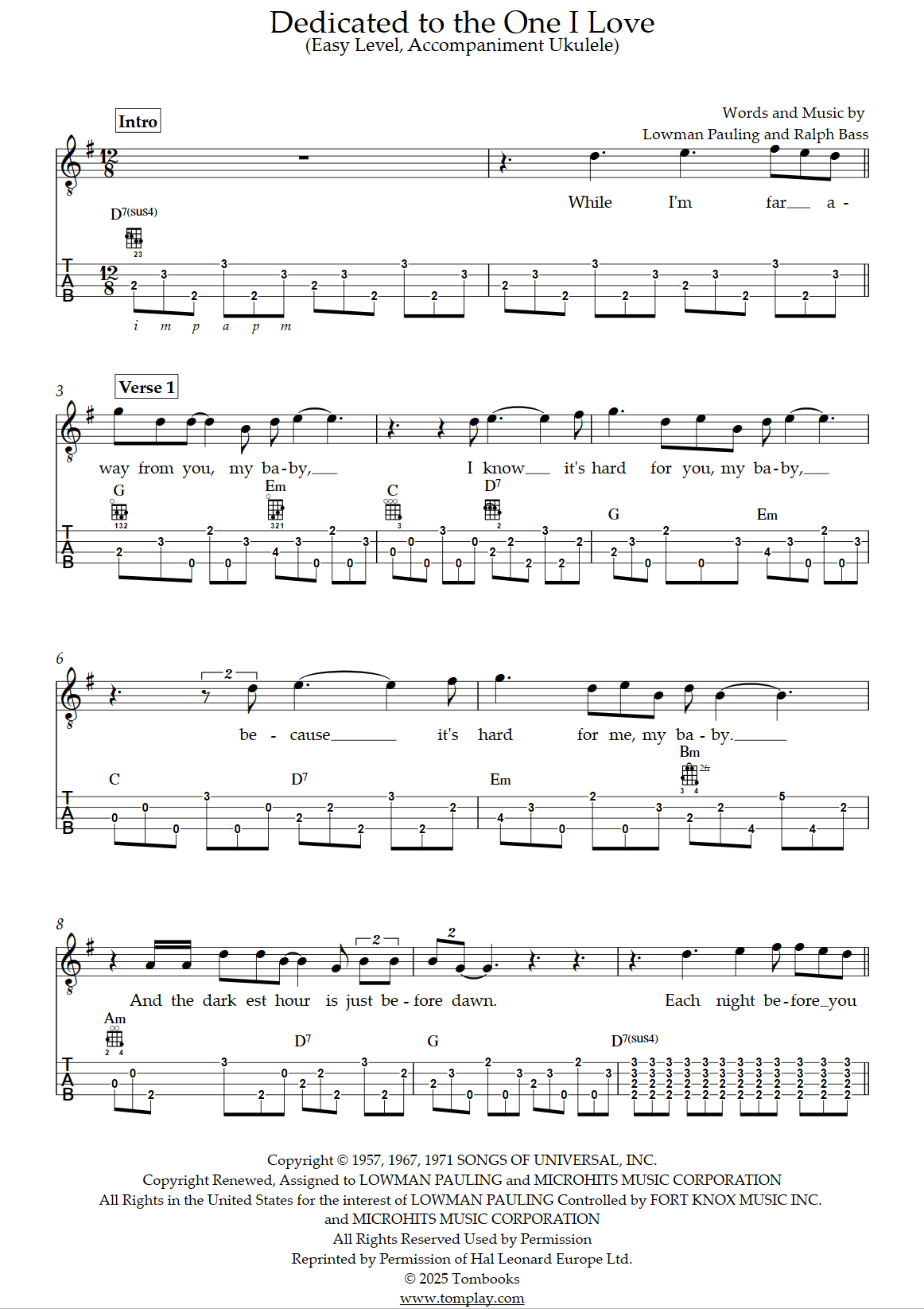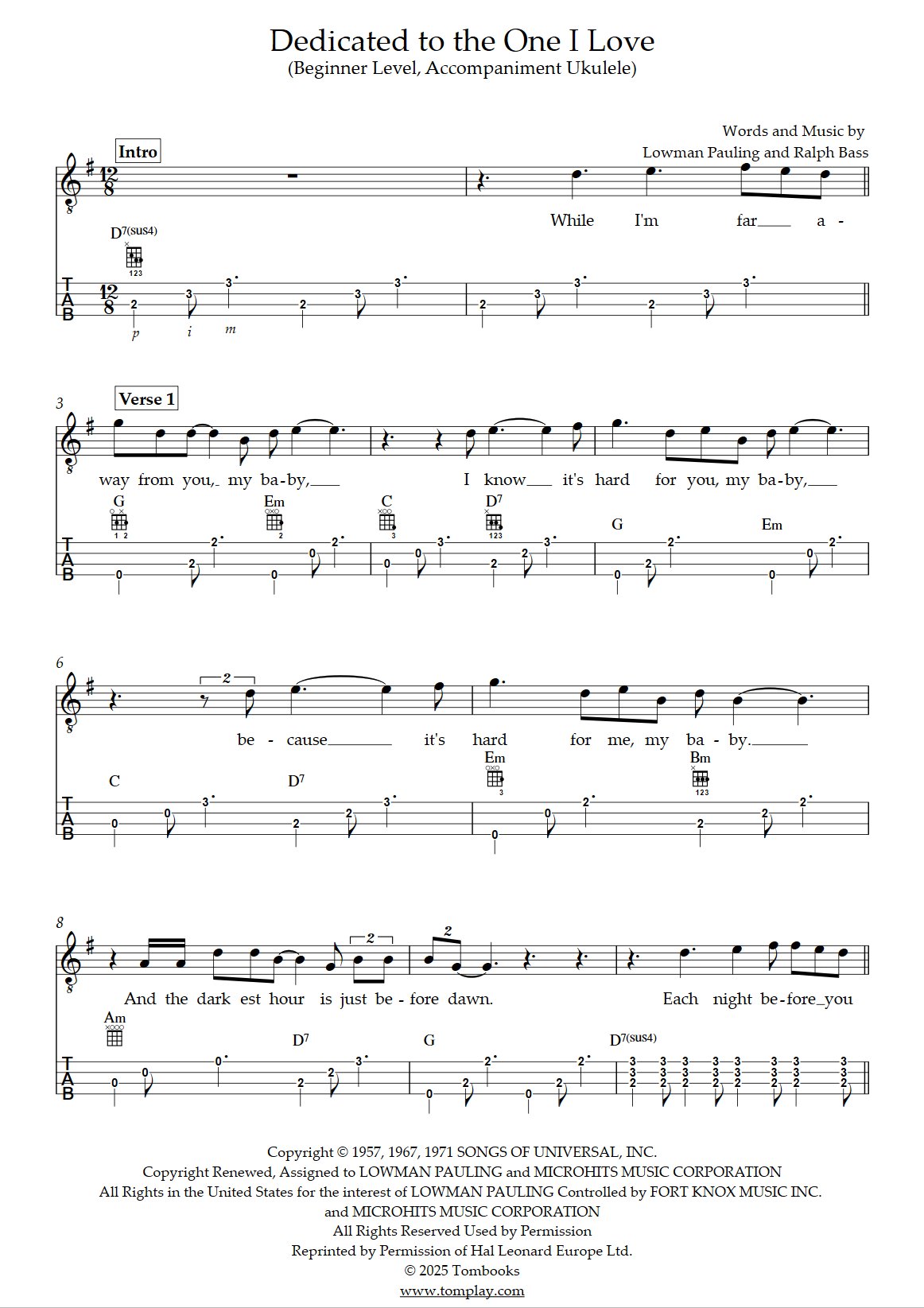 The Mamas & The Papas: Dedicated To The One I Love sheet music to print instantly for ukulele