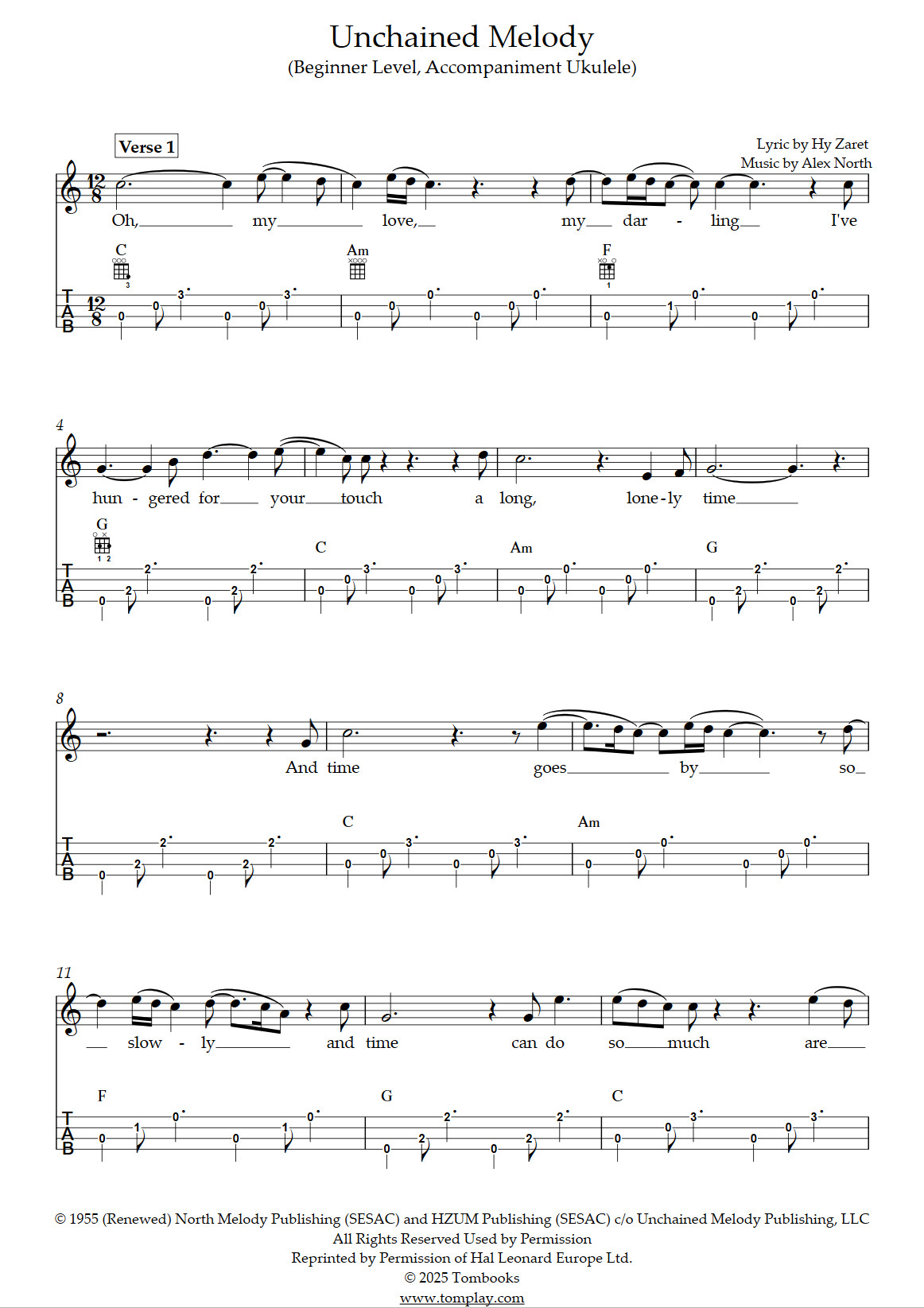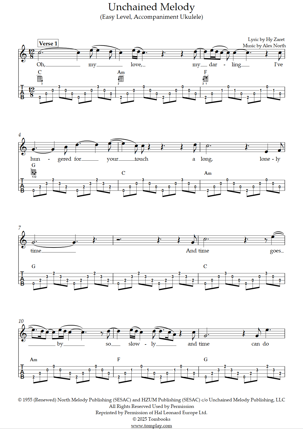 Téléchargez la partition Ukulélé Unchained Melody (niveau facile, ukulélé d'accompagnement…
