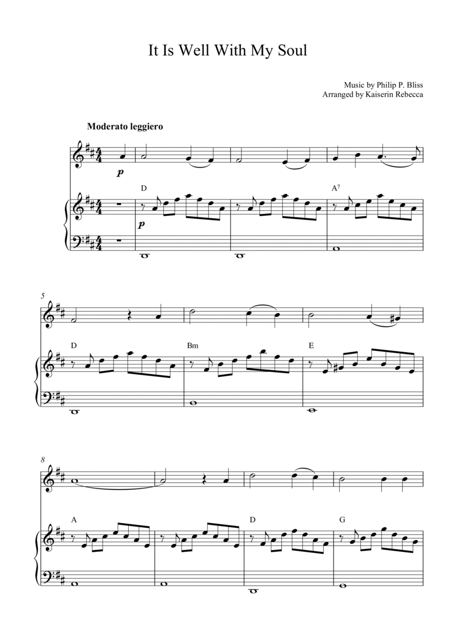 Piano Quartet,String Ensemble Cello,Piano,Violin - Level 3 - Digital Download SKU: A0.1144151 Composed by Horatio Spafford, Philip P. Bliss. Arranged by John A. Dempsey. Christian,Easter,Praise & Worship,Sacred,Traditional. Score and parts. 20 pages. John A. Dempsey #744470. Published by John A. Dempsey (A0.1144151). An unforgettable hymn of comfort and assurance, this peaceful string quartet for two violins, cello and piano is recommended for traditional church services and other worship events (including funerals), as a prelude, postlude, an offertory, interlude, silent prayer accompaniment and special music. Key: D major. 16 pages of music (that includes the score and separate two-parts for violin 1, violin 2 and cello).          When peace like a river attendeth my way     When sorrows like sea billows roll;     Whatever my lot, Thou hast taught me to say     It is well, it is well with my soul.