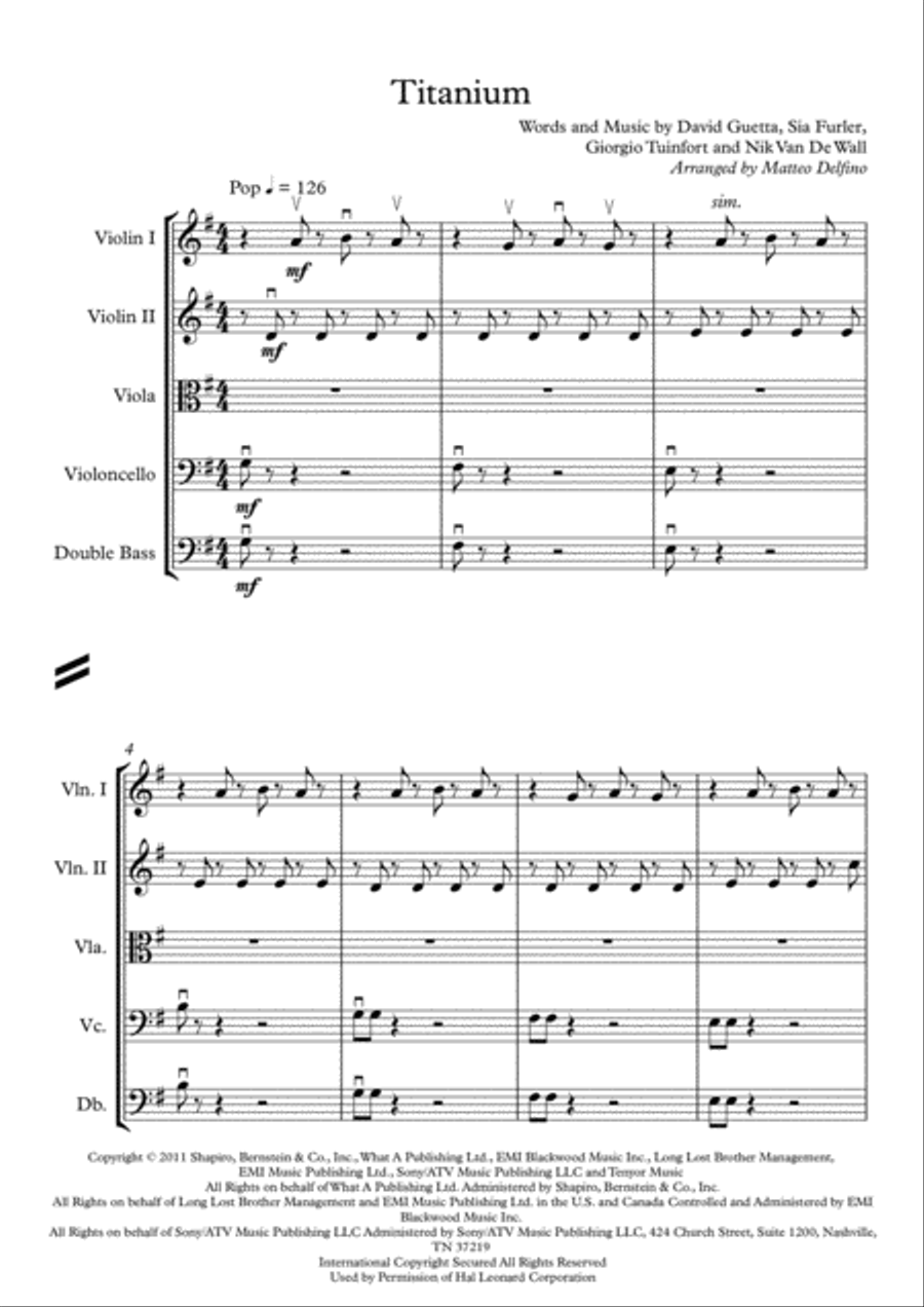 String Orchestra - Digital Download SKU: A0.809235 By David Guetta Featuring Sia. By David Guetta, Giorgio Tuinfort, Nick Van De Wall, and Sia. Arranged by Rodrigo Prado & Uesile Prado. Pop. Score and parts. 21 pages. BETSUEL UESILE DO PRADO #6356455. Published by BETSUEL UESILE DO PRADO (A0.809235). The energic Titanium from David Guetta is now arranged for String Orchestra. Enjoy.