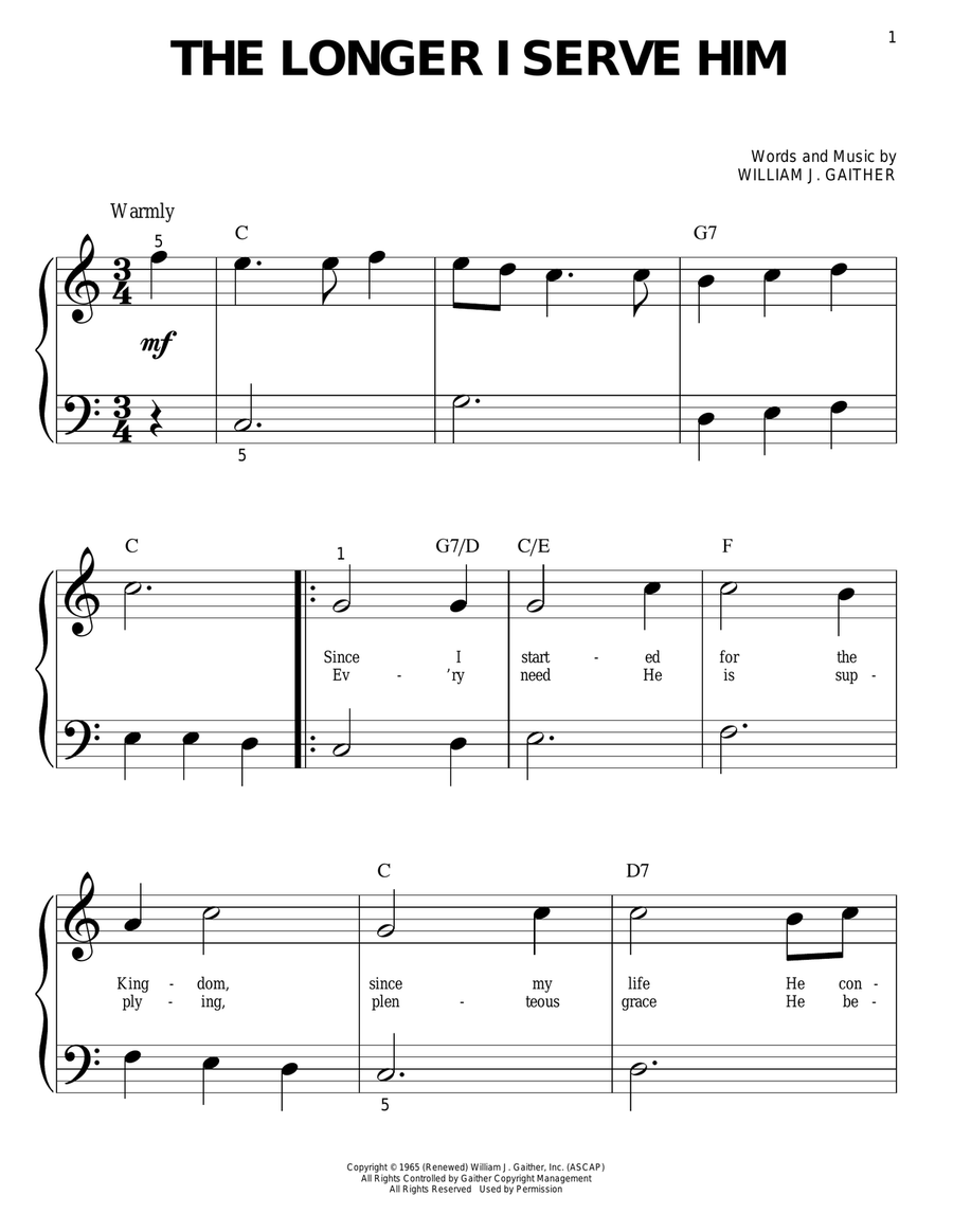 Easy Piano - Level 1 - Digital Download SKU: A0.1079333 Composed by Bill Gaither and Gloria Gaither. Arranged by Samuel Stokes. Praise & Worship,Sacred,Spiritual,Standards. Score. 2 pages. SamuelStokesMusic.com #683535. Published by SamuelStokesMusic.com (A0.1079333). This is an arrangement of I Will Serve Thee for easy piano in C major. Learn more about Samuel Stokes at https://www.SamuelStokesMusic.com.