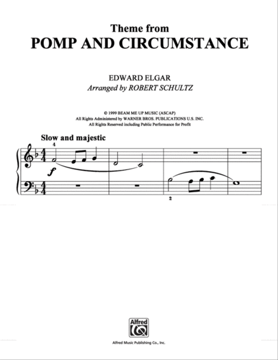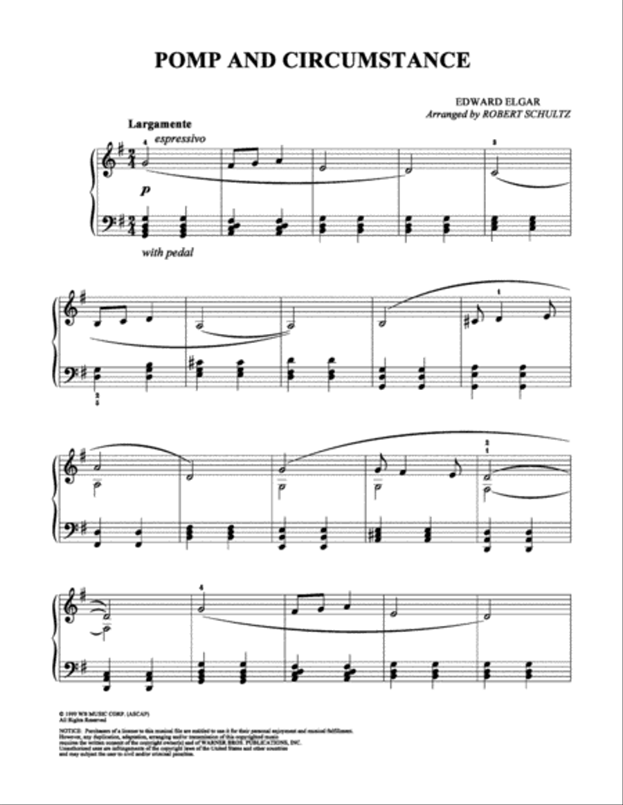 Easy Piano - Level 1 - Digital Download SKU: A0.1179244 Composed by Edward Elgar. Arranged by César Madeira. 19th Century,Children,Film/TV,Multicultural,Romantic Period,World. Score. 2 pages. Sheet Music To Play Editions #779205. Published by Sheet Music To Play Editions (A0.1179244). Pomp and Circumstance (Military March No.1 in D major). Arrangement for Elementary Piano. Full Score with Chords. Enjoy it!Sir Edward William Elgar (1857 - 1934) was an English composer, many of whose works have entered the British and international classical concert repertoire. Among his best-known compositions are orchestral works including the Enigma Variations, the Pomp and Circumstance Marches, concertos for violin and cello, and two symphonies. He also composed choral works, including The Dream of Gerontius, chamber music and songs. He was appointed Master of the King's Musick in 1924.For Tutorials, Play Alongs or request New Arrangements, visit the YouTube Channel: Sheet Music To Play