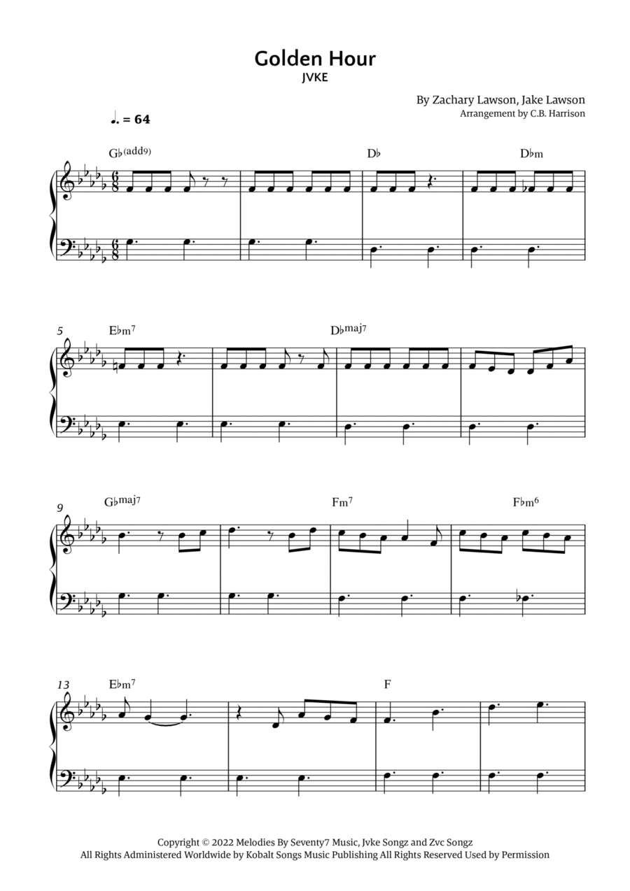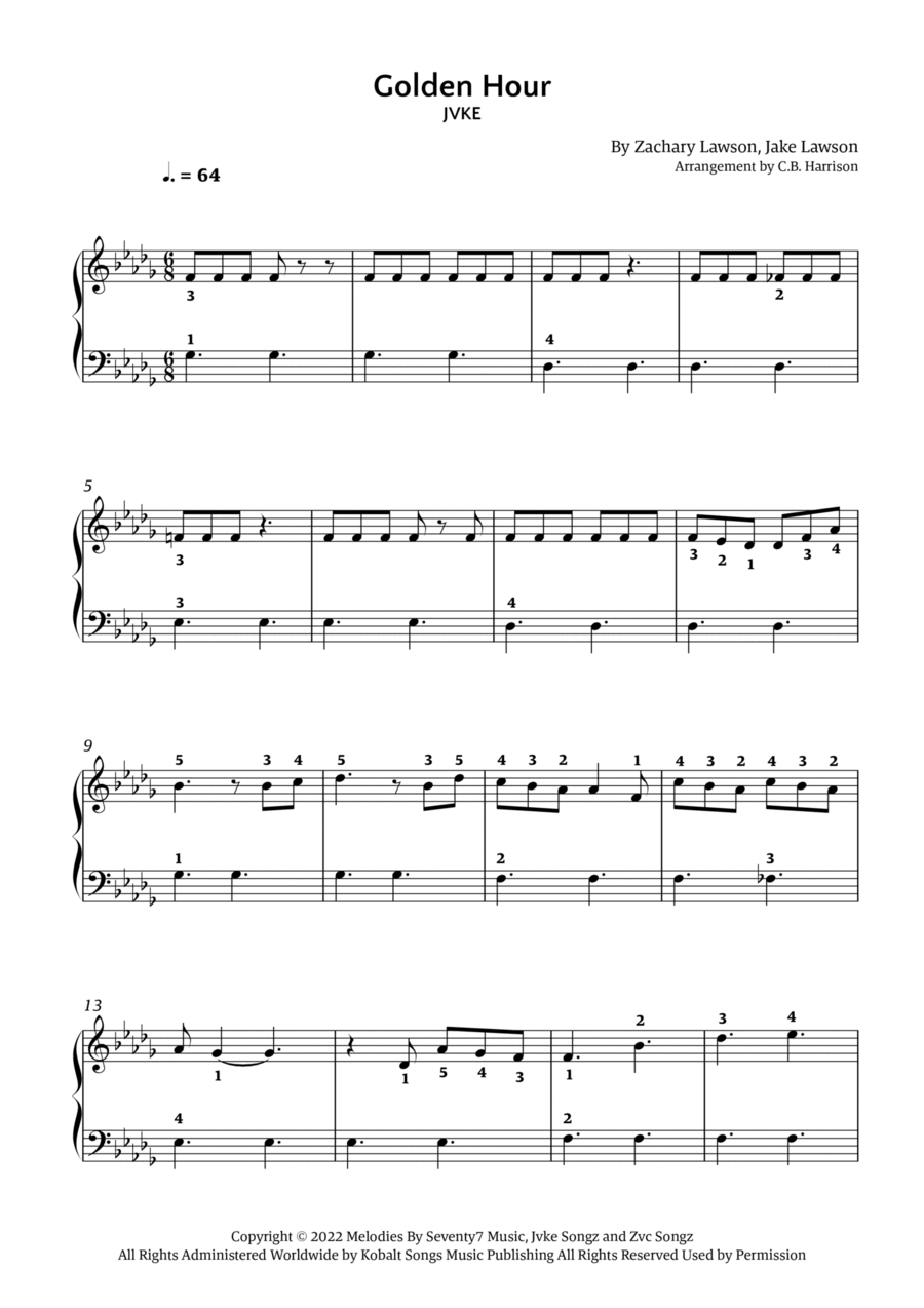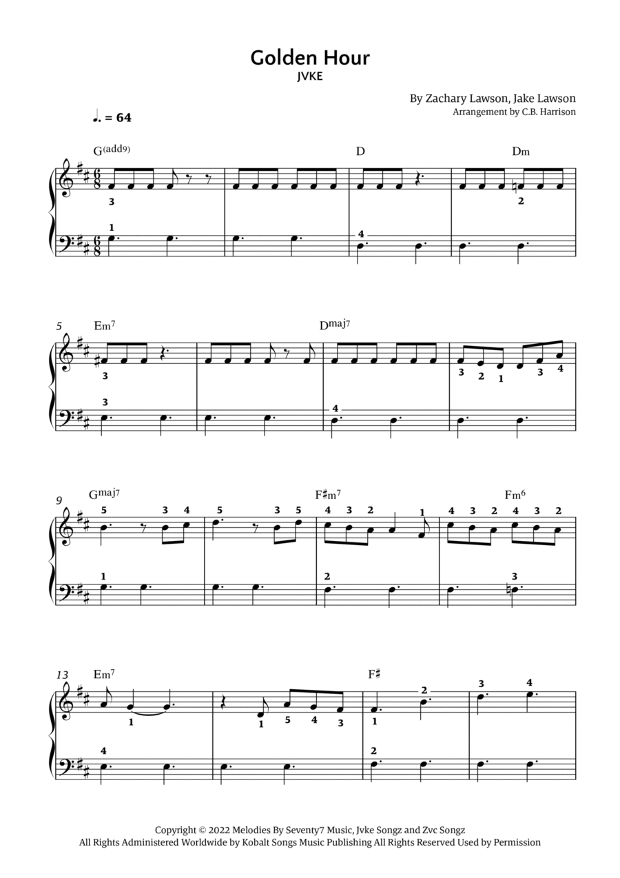 Easy Piano - Level 1 - Digital Download SKU: A0.1353318 By Jvke. By Jake Lawson and Zachary Lawson. Arranged by RIS. Folk,Hip-Hop,Pop,R & B,Soul. Score. 1 pages. RISsounds #938087. Published by RISsounds (A0.1353318). 🎼 Master Golden Hour by JVKE effortlessly with our Easy Piano Lead Sheet Music! Accessible for all skill levels, our clear notation serves as the perfect companion to our detailed piano tutorial on YouTube.🌟 What sets our lead sheet music apart? It provides a clear roadmap for playing the melody and chords, making it an ideal resource for solo performances, group sessions, or skill development. Whether you're a beginner or an advanced pianist, our sheet music offers a unique blend of guidance and freedom, making it an ideal choice for players of all skill levels. Paired with our YouTube tutorial featuring falling lights and a cursor guide, learning this catchy tune has never been more enjoyable!🎶 Song: Golden Hour by JVKE 🔠Difficulty Level: Easy📌 Enhance your musical journey with this valuable resource, combining the joy of playing with hands-on guidance. Perfect for pianists of all levels, our lead sheet music is designed to make learning and playing Golden Hour a seamless and enjoyable experience.🎹 Download our Golden Hour Easy Piano Lead Sheet Music now and dive into a musical adventure that combines the joy of playing with clear, accessible notation! 🌟.