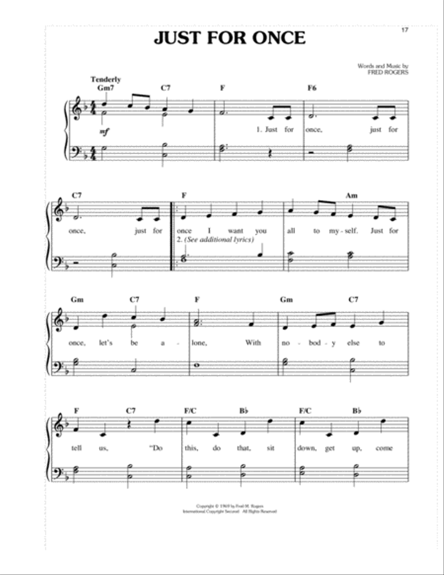 Level 1 - Interactive Download SKU: A0.1166541 Composed by Fred Rogers. Arranged by Krystal Wee. This edition: Interactive Download. Children. Lead Sheet / Fake Book. 2 pages. Duration 93. Krystal Wee #6PsgCjgguxJrRQt0nqY8cx. Published by Krystal Wee (A0.1166541). Key: F major.Mister Rogers' Lead Sheet. Song for emotional regulation, anger management, negative emotions, music therapy etc.