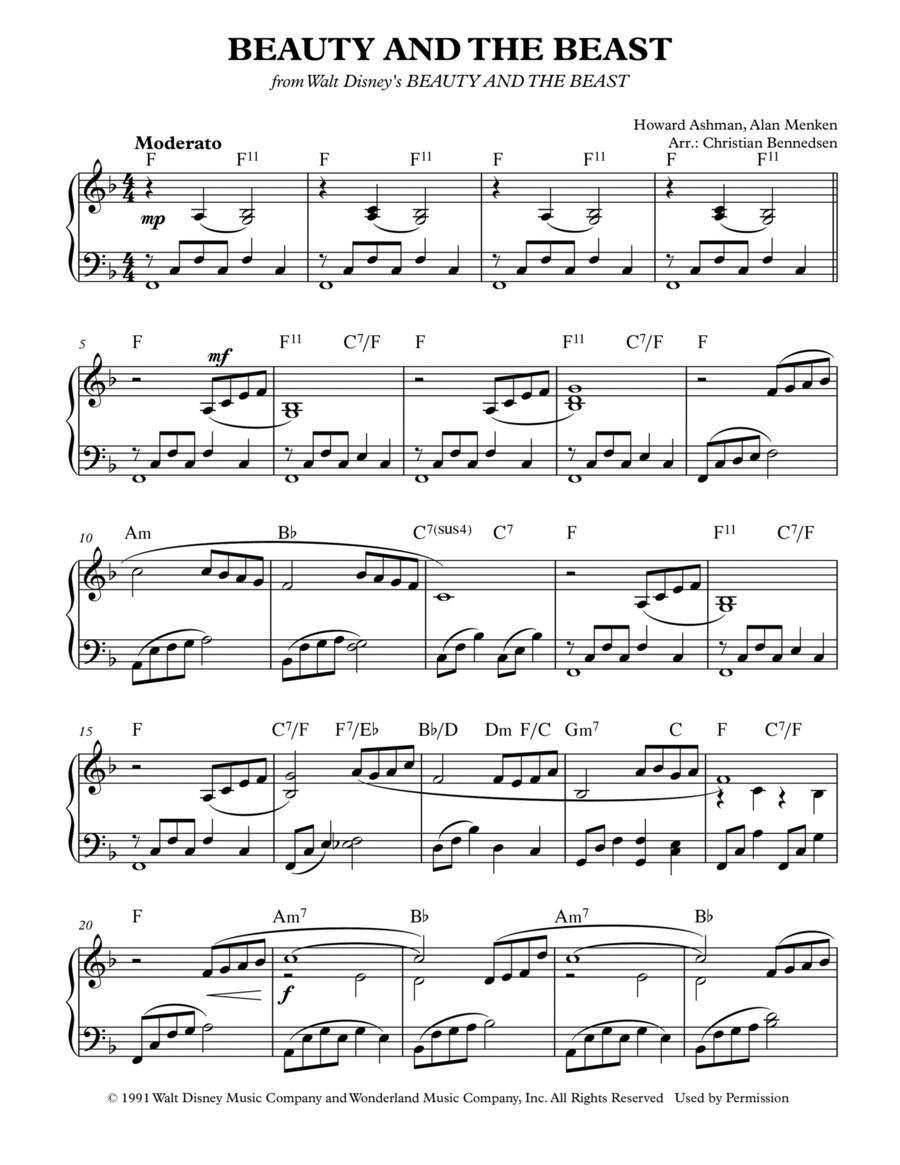 Easy Piano - Level 2 - Digital Download SKU: A0.1252440 By Celine Dion & Peabo Bryson. By Alan Menken and Howard Ashman. Arranged by Glauco Fernandes. Broadway,Children,Classical,Film/TV,Instructional,Musical/Show. Score. 2 pages. Glauco Fernandes #846410. Published by Glauco Fernandes (A0.1252440). Introducing an easy piano arrangement of the Disney's classic song Beauty and the Beast. Now you can learn to play this enchanting melody on your own piano, in a simple and instructional way.Our arrangement has been carefully adapted for pianists of different levels, offering an accessible approach for those who want to learn to play this beloved song. With simplified notes, you will be able to master the melody and charm yourself and others with the beauty of this iconic music.This easy piano arrangement of Beauty and the Beast is perfect for beginners and experienced pianists alike, looking for a simplified version of the song. With it, you can enhance your musical skills and expand your repertoire with one of Disney's most beloved tunes.Imagine the thrill of playing this song at a special moment, like a wedding. With its romantic and captivating melody, Beauty and the Beast creates a magical and enchanting atmosphere, making it a perfect choice for unforgettable moments.Discover the joy of playing Beauty and the Beast on your own piano. Get our easy arrangement now and start exploring the musical wonders that this melody has to offer in various special moments of your life. Ariana Grande, John LegendCéline Dion, Peabo Bryson