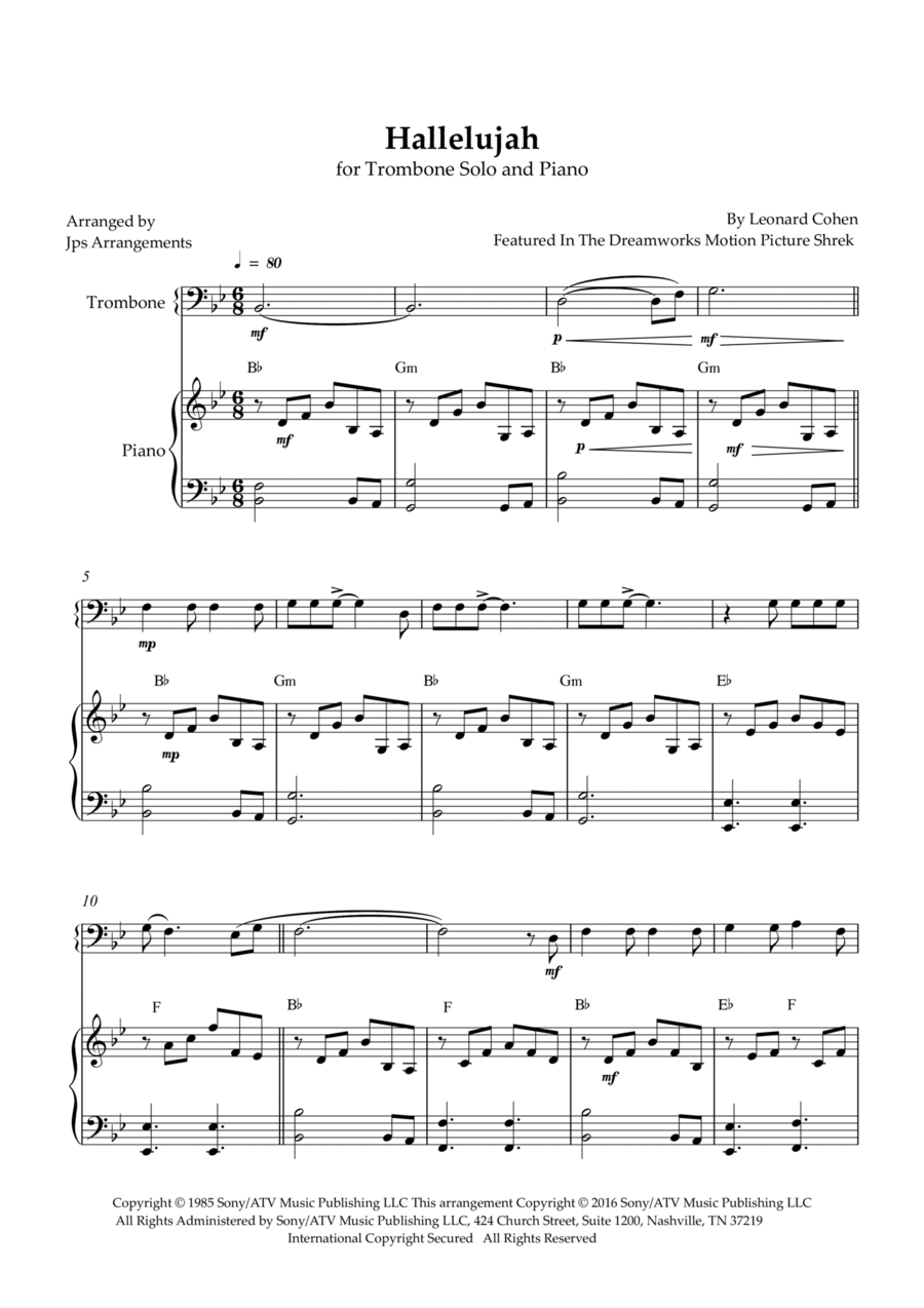 Piano,Tenor Trombone - Level 2 - Digital Download SKU: A0.1444478 By Andrea Bocelli. By Leonard Cohen. Arranged by Glauco Fernandes. Chamber,Film/TV,Instructional,Pop,Wedding. Score and part. 4 pages. Glauco Fernandes #1024330. Published by Glauco Fernandes (A0.1444478). Você está procurando um arranjo de partituras que combine facilidade de execução com qualidade profissional? Apresentamos nosso arranjo simplificado de “Hallelujah”, a icônica música de Leonard Cohen, também presente na trilha sonora do filme Shrek. Este arranjo é perfeito para estudantes que buscam um repertório satisfatório e desafiador, além de ser uma excelente ferramenta de ensino para educadores.Nosso arranjo é ideal para músicos de todos os níveis, inclusive profissionais que necessitam de praticidade e qualidade em suas apresentações. Seja para eventos, shows ou casamentos, esse arranjo oferece a combinação perfeita entre simplicidade e sofisticação, permitindo interpretar essa linda música com maestria e emoção.Obtenha sua partitura agora e leve suas apresentações musicais a um novo nível. Garanta um material que alie acessibilidade e excelência, atendendo às necessidades de músicos exigentes e comprometidos com a qualidade.Tags: partituras, arranjo simplificado, Aleluia, Leonard Cohen, trilha sonora, Shrek, estudantes de música, professores de música, músicos profissionais, eventos, casamentos, repertório musical, material didático, qualidade profissional, praticidade.