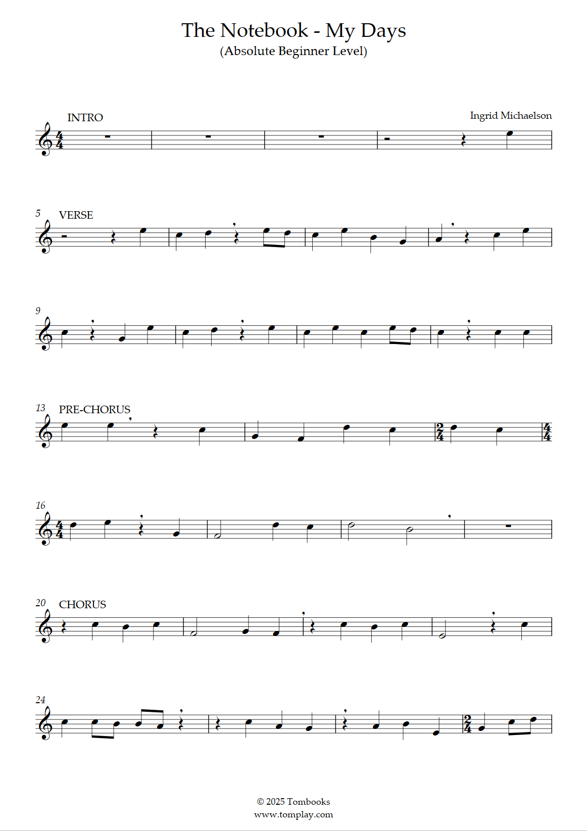 Téléchargez la partition Saxophone The Notebook - My Days (niveau très facile, sax ténor) …