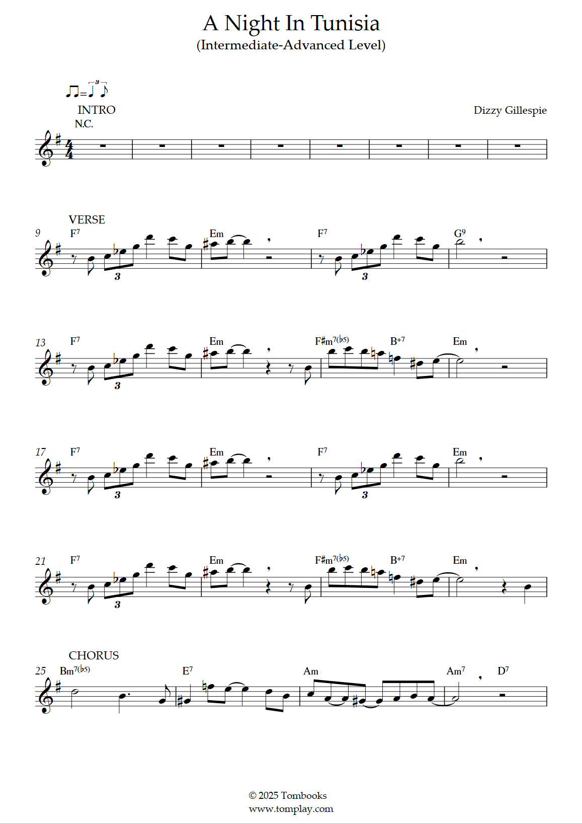 Téléchargez la partition Saxophone A Night in Tunisia (niveau facile, sax ténor) de Dizzy …
