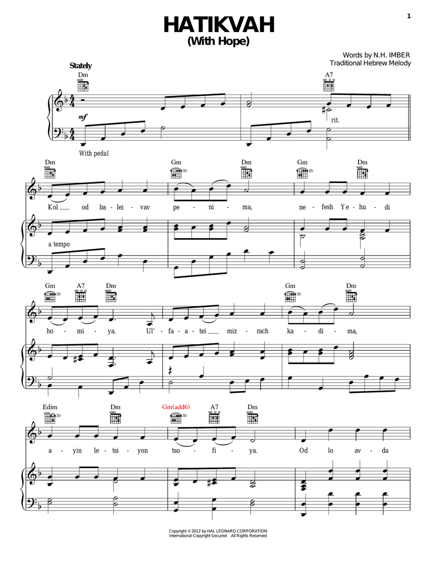 Miscellaneous: Hatikvah (With Hope) for voice, piano and guitar