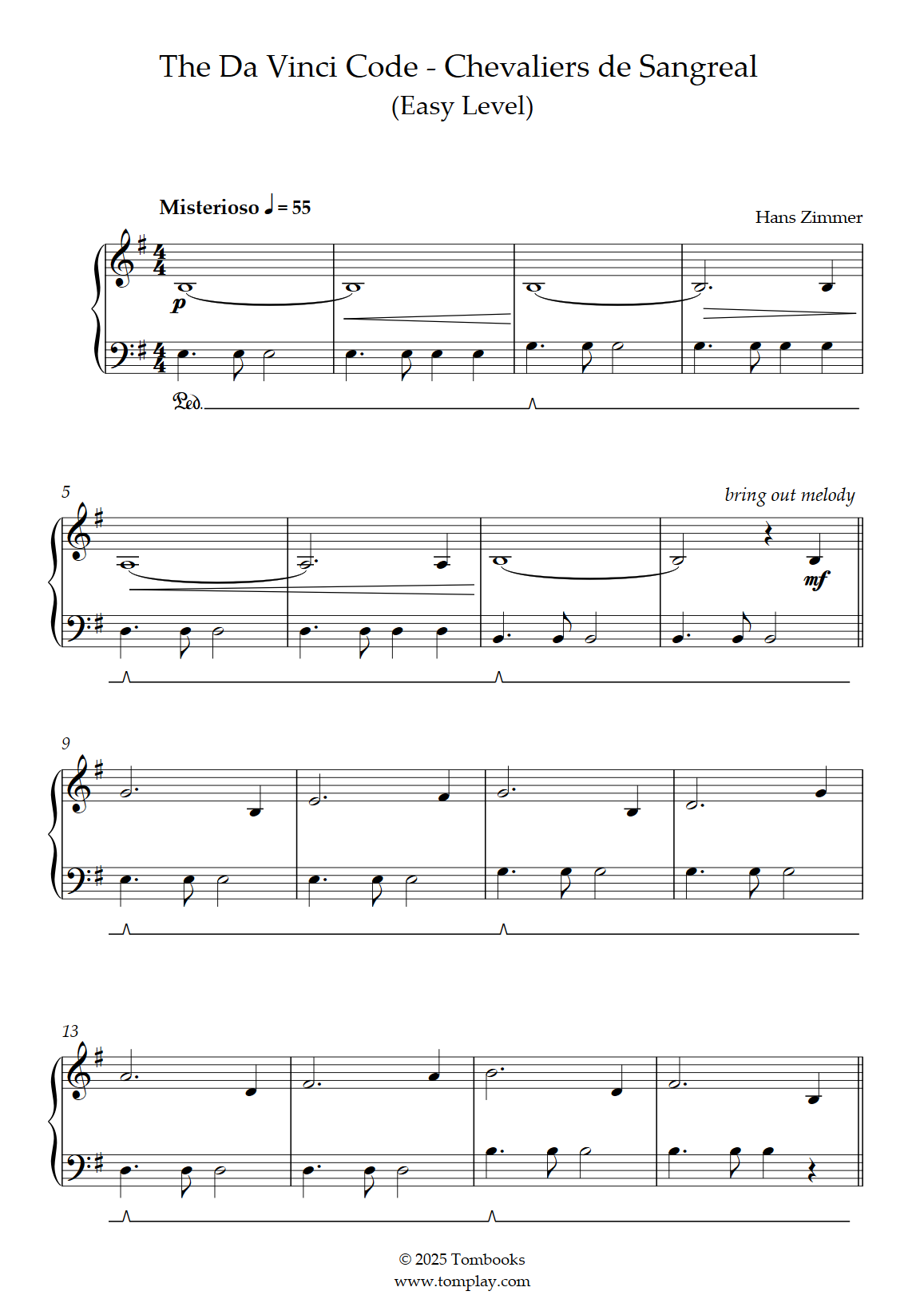 Hans Zimmer : The Da Vinci Code - Chevaliers de Sangreal (niveau intermédiaire, piano solo)