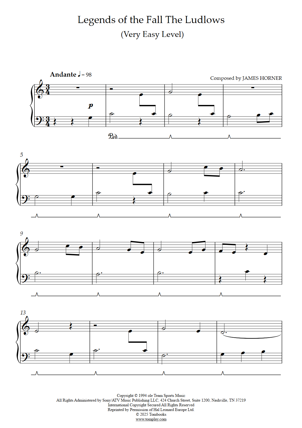 James Horner : Légendes d'automne - The Ludlows (niveau très facile, piano solo)