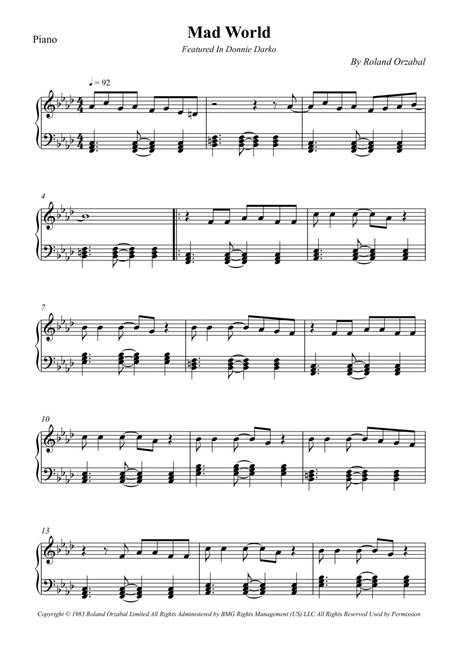 Piano Solo - Level 3 - Digital Download SKU: A0.1404272 By Michael Andrews Feat. Gary Jules. By Roland Orzabal. Arranged by Mario Stallbaumer. Film/TV,Pop. Score. 3 pages. Mario Stallbaumer #987383. Published by Mario Stallbaumer (A0.1404272). With this sheet music, you can play Mad World on the piano!It's an accurate, carefully created piano arrangement based on the famous recording by Gary Jules & Michael Andrews.Ā The song was written by Roland Orzabal, who recorded it in 1982 with his band Tears for Fears.Ā In 2001, Michael Andreas and Gary Jules recorded their version of the song for the film Donnie Darko.Ā It became a big international hit and topped the British charts for three weeks!The calm, melancholic song makes for a beautiful piano ballad!If you want to see more of my work, you can visit my YouTube channel.