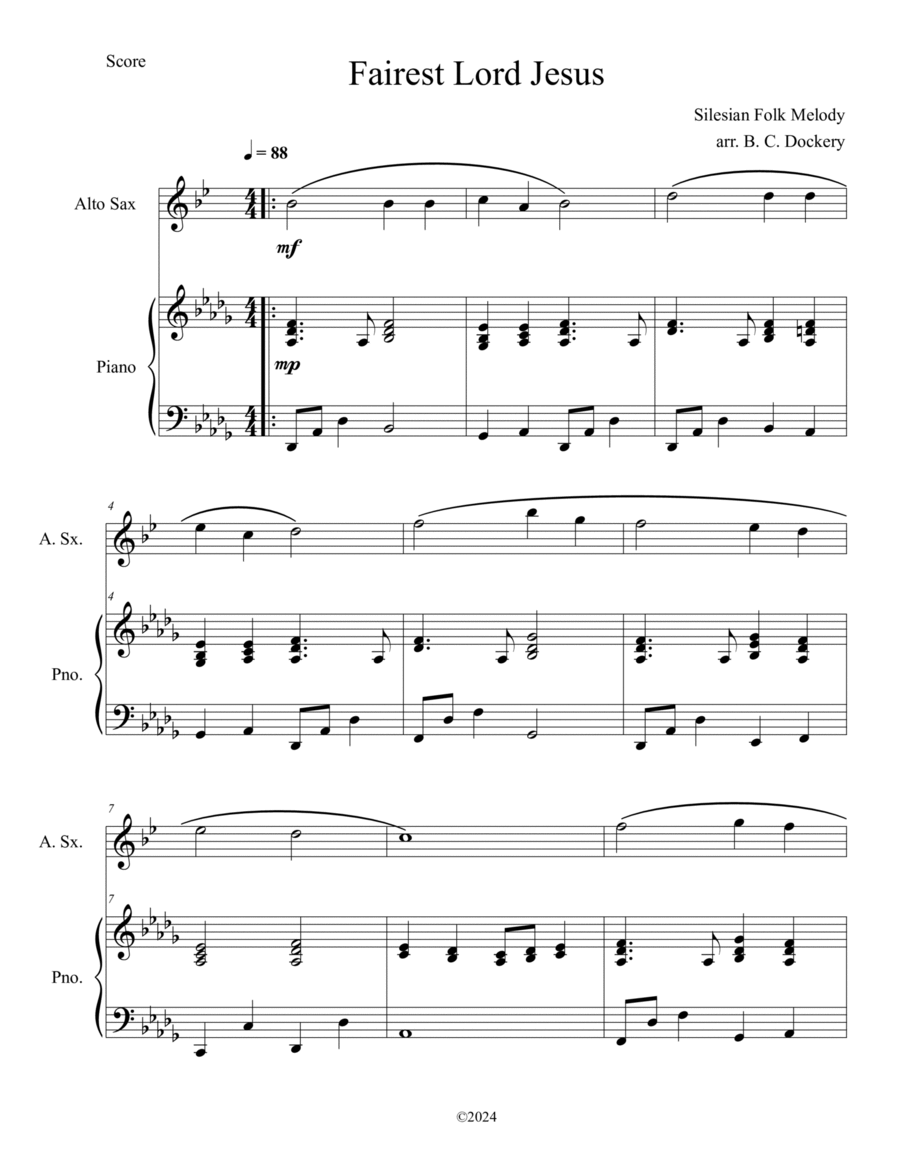 Alto Saxophone,Piano - Level 2 - Digital Download SKU: A0.1510447 Composed by Various. Arranged by B. C. Dockery. Christian,Easter,Lent,Religious,Sacred. Score and part. 207 pages. Ben Dockery #1085642. Published by Ben Dockery (A0.1510447). These fifty classic hymns have been arranged for alto saxophone solo with piano accompaniment. They are easy enough for early intermediate students to learn or for more advanced players to sight-read. Great for preludes, offertories, postludes, recitals, and lessons. Includes both scores and individual parts.A Mighty Fortress Is Our GodAbide with MeAll Creatures of Our God and KingAll Hail the Power of Jesus’ NameAlleluia! Alleluia! (Ode to Joy)Amazing GraceAre You Washed in the Blood?At the CrossBe Thou My VisionBlessed AssuranceChrist Arose (Low in the Grave He Lay)Christ the Lord is Risen TodayCome, Christians, Join to SingCome, Thou Fount of Every BlessingCome, Thou Long-Expected JesusCrown Him with Many Crowns Down at the CrossFairest Lord JesusHe Leadeth MeHe Lives (I Know That My Redeemer Lives!)Holy, Holy, HolyHow Great Thou ArtI Stand Amazed in the Presence (How Marvelous)In the GardenIt Is Well with My SoulJesus Loves MeJesus Paid It AllJesus SavesJust as I AmLove Divine, All Loves ExcellingMy Hope Is Built On Nothing LessNear the CrossNearer, My God, to TheeNothing but the BloodO For A Thousand Tongues To SingO Sacred Head, Now WoundedO the Blood of JesusO Worship the KingOnward, Christian SoldiersRock Of AgesShall We Gather at the RiverTell Me the Story of JesusThe Old Rugged CrossThere is a FountainTo God Be the GloryWe Gather TogetherWere You ThereWhat A Friend We Have in JesusWhat Wondrous Love Is ThisWhen I Survey the Wondrous CrossBecause this is a single bound book, photocopies are permitted for performance purposes.