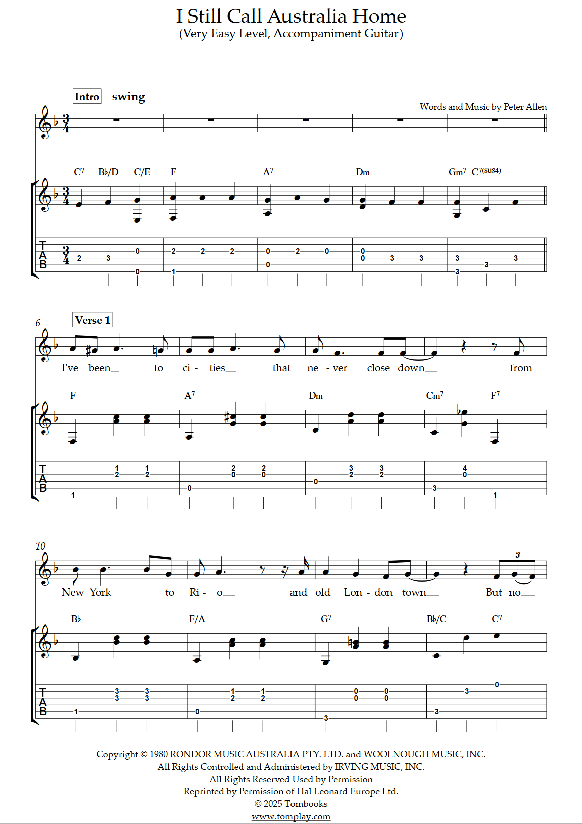 Guitar - Level 3 - Digital Download SKU: A0.1357622 Composed by Peter Allen. Arranged by Rafael Milhomem. Classical,Multicultural,Singer/Songwriter,Standards,Traditional,World. 31 pages. Milhomusic #942151. Published by Milhomusic (A0.1357622). I Still Call Australia Home - A Captivating Musical Journey for Choir and Guitar Orchestra by Rafael MilhomemIt is with immense pride that we present the sheet music for Rafael Milhomem's vibrant and passionate arrangement of Peter Allen's iconic I Still Call Australia Home. This brilliant work is a musical celebration of Australia, transforming Allen's timeless melody into a unique experience for choir and guitar orchestra.Arrangement Highlights:Celebrating Australian Identity: Milhomem's arrangement captures the essence of the original song, enriching it with emotional nuances and a distinctive touch, creating an atmosphere that resonates with the Australian soul.Captivating Interaction between Choir and Guitar Orchestra: The sheet music highlights a magical fusion of angelic voices and the vibrant strings of guitars, resulting in an engaging and memorable sonic experience.Eclectic Structure: Milhomem's ability to blend classical and contemporary elements provides a unique and emotionally rich interpretation of the piece, suitable for a variety of musical contexts.About the Arranger: Renowned for his passionate performances and innovative arrangements, Rafael Milhomem has invested his meticulous craftsmanship and passion into this creation. His artistic vision and technical prowess shine through, elevating the musical experience to new heights.Technical Information:Instrumentation: Choir and Guitar OrchestraApproximate Duration: [2´11´´]Experience the Australian Musical Magic: By acquiring this unique sheet music, you are invited to immerse yourself in a musical journey that not only pays tribute to Australia but also provides an exceptional experience for your musicians and audience. Contact us for more details on how to make this captivating work part of your repertoire.We appreciate your consideration and look forward to contributing to the elevation of your musical expression.Check out another sheet music by Rafael Milhomem!!!#Classicalguitar #Guitarorquestra #guitarquartet #Guitarensemble #Choirandguitar #Childorchestra #Choir.