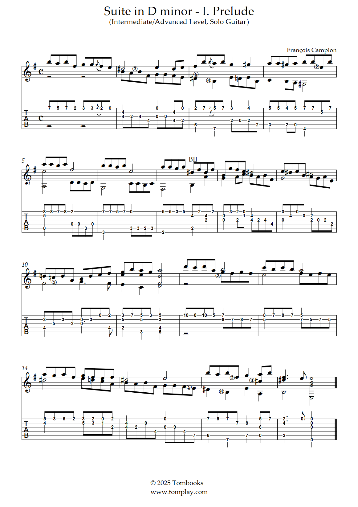 Campion François : Suite en ré mineur - I. Prelude (niveau intermédiaire/difficile, guitare seule)