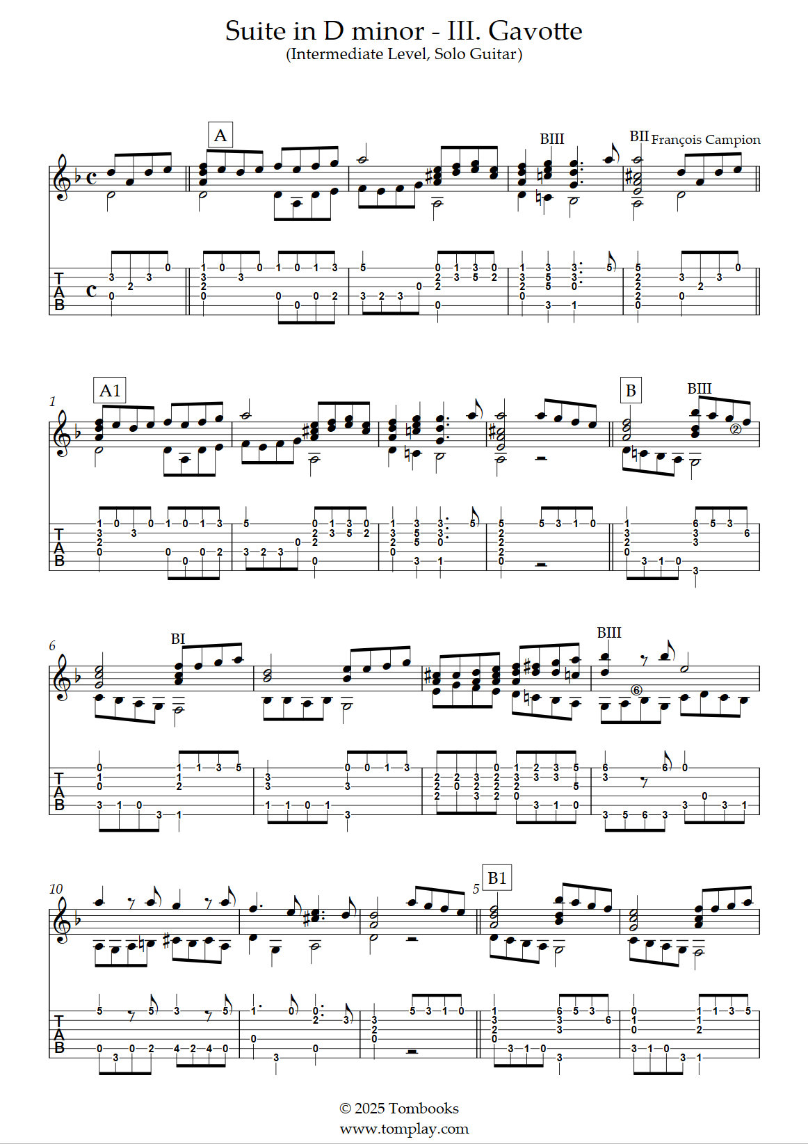 Campion François : Suite en ré mineur - III. Gavotte (niveau intermédiaire, guitare seule)