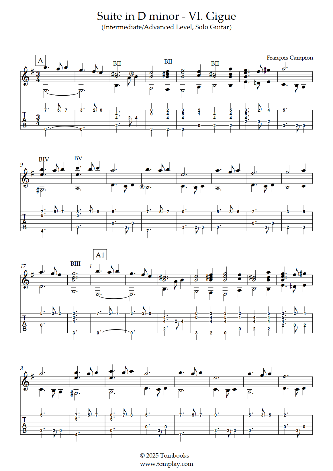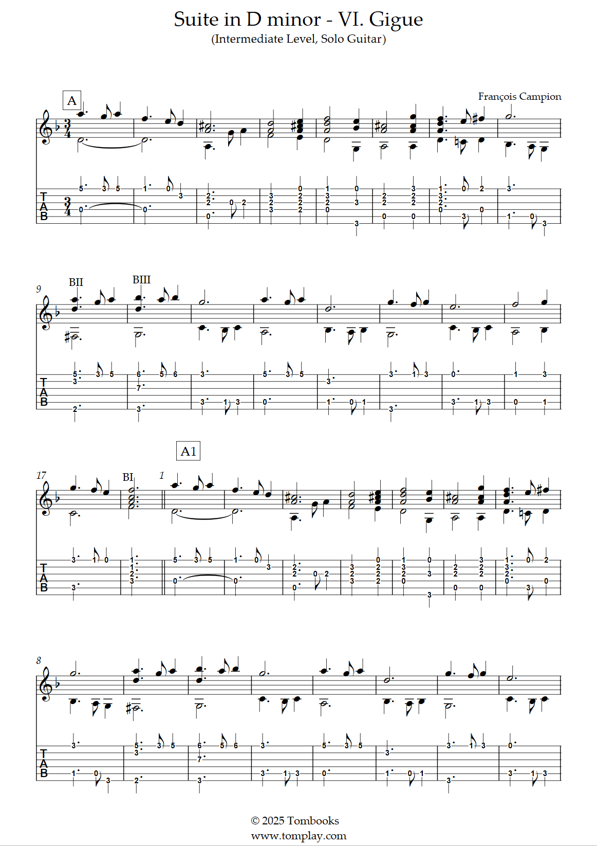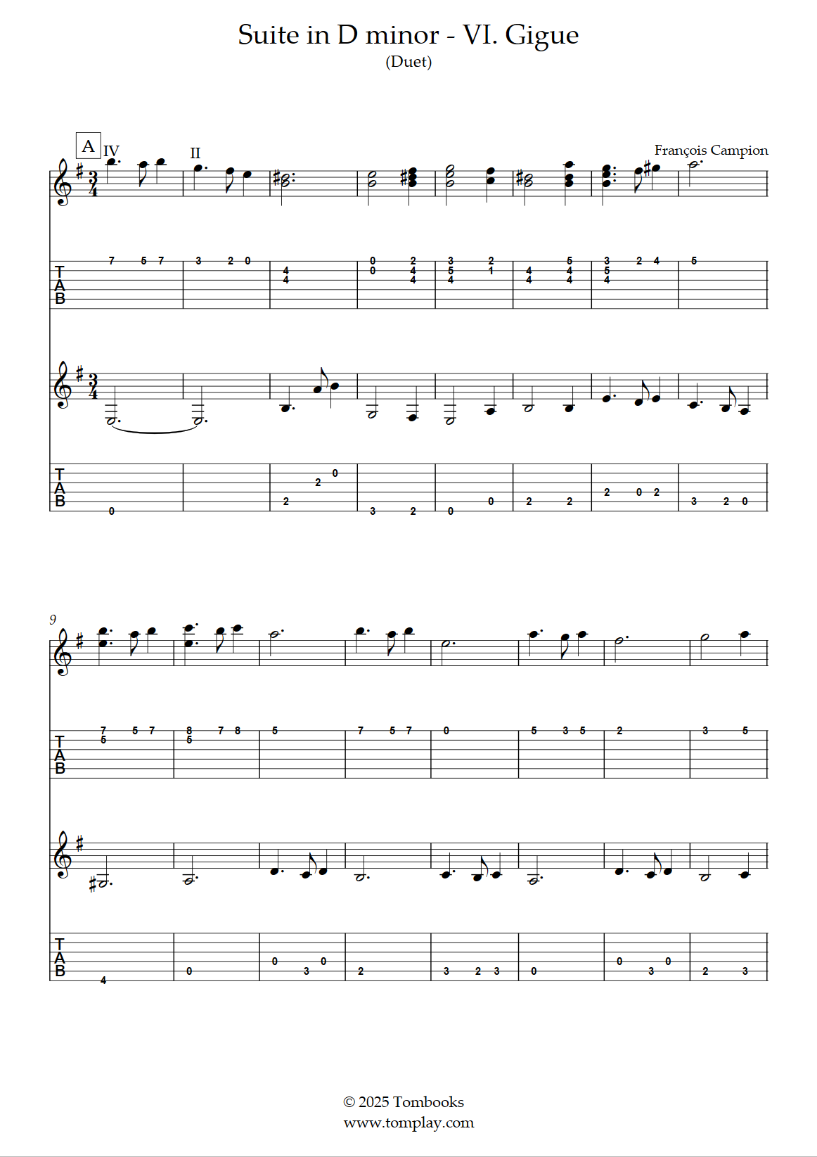Campion François : Suite en ré mineur - VI. Gigue (niveau intermédiaire, guitare seule)