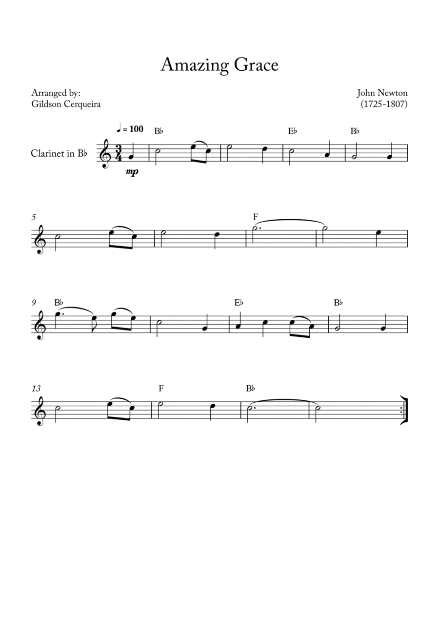 B-Flat Clarinet Solo - Level 1 - Digital Download SKU: A0.1186145 Composed by Christopher Smith, John Newton, and Traditional. Arranged by Josiel Oliveira. Christian,Praise & Worship,Religious,Spiritual. Individual part. 1 pages. M das Melodias #785800. Published by M das Melodias (A0.1186145). Amazing Grace é uma música cristã que se tornou um hino popular em todo o mundo, e é frequentemente tocada em funerais, serviços religiosos e eventos solenes. A música foi escrita pelo poeta e clérigo anglicano John Newton no século XVIII, originalmente como um hino para o serviço dominical da Igreja da Inglaterra.Sheet Music for Clarinet in Bb.A letra da música fala sobre a graça redentora de Deus e a salvação que Ele oferece a todos, independentemente de suas falhas e pecados. A letra também reflete a própria história de vida de Newton, que anteriormente era um comerciante de escravos, mas depois se converteu ao cristianismo e se tornou um defensor da abolição da escravidão.A melodia da música é baseada em uma antiga melodia escocesa, e é simples e comovente, permitindo que as letras se destaquem. A música é geralmente cantada em um ritmo lento e emocional, com arranjos instrumentais minimalistas que destacam ainda mais a beleza das letras.Amazing Grace é considerada uma das músicas mais conhecidas e amadas da tradição cristã, e já foi gravada por inúmeros artistas em todo o mundo, em uma variedade de estilos musicais diferentes. A música também é um exemplo do poder da música em conectar as pessoas, independentemente de sua fé ou crenças, e em oferecer conforto e esperança em tempos difÃceis.