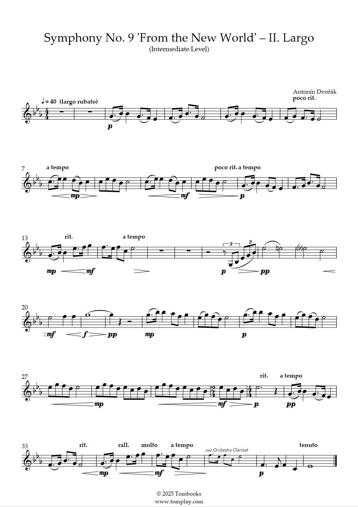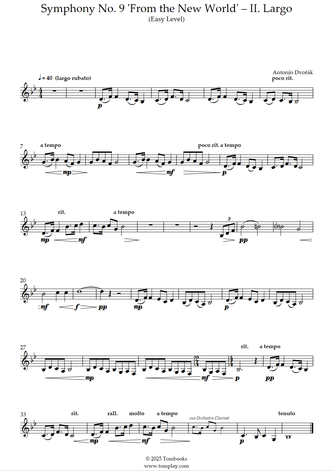 B-Flat Clarinet Solo - Level 1 - Digital Download SKU: A0.1275456 Composed by Antonin Dvorak. Arranged by Rodrigo Faleiros. 19th Century,Chamber,Christmas,Romantic Period,Wedding. Individual part. 1 pages. Rodrigo Faleiros #867247. Published by Rodrigo Faleiros (A0.1275456). Step into a world of musical enchantment with this adaptation of the Largo, 2nd movement from Antonin Dvorak's Symphony no. 9, From the New World. Designed for an easy solo clarinet in Bb with chord symbols for another musician to play along, this rendition has been carefully tailored to embrace aspiring musicians and create an intimate ambiance, making it a perfect choice for students, weddings, graduations and other special gatherings. The arrangement is transposed to the key of F major, ensuring ease for beginners, allowing them to delve into the soulful melodies effortlessly.