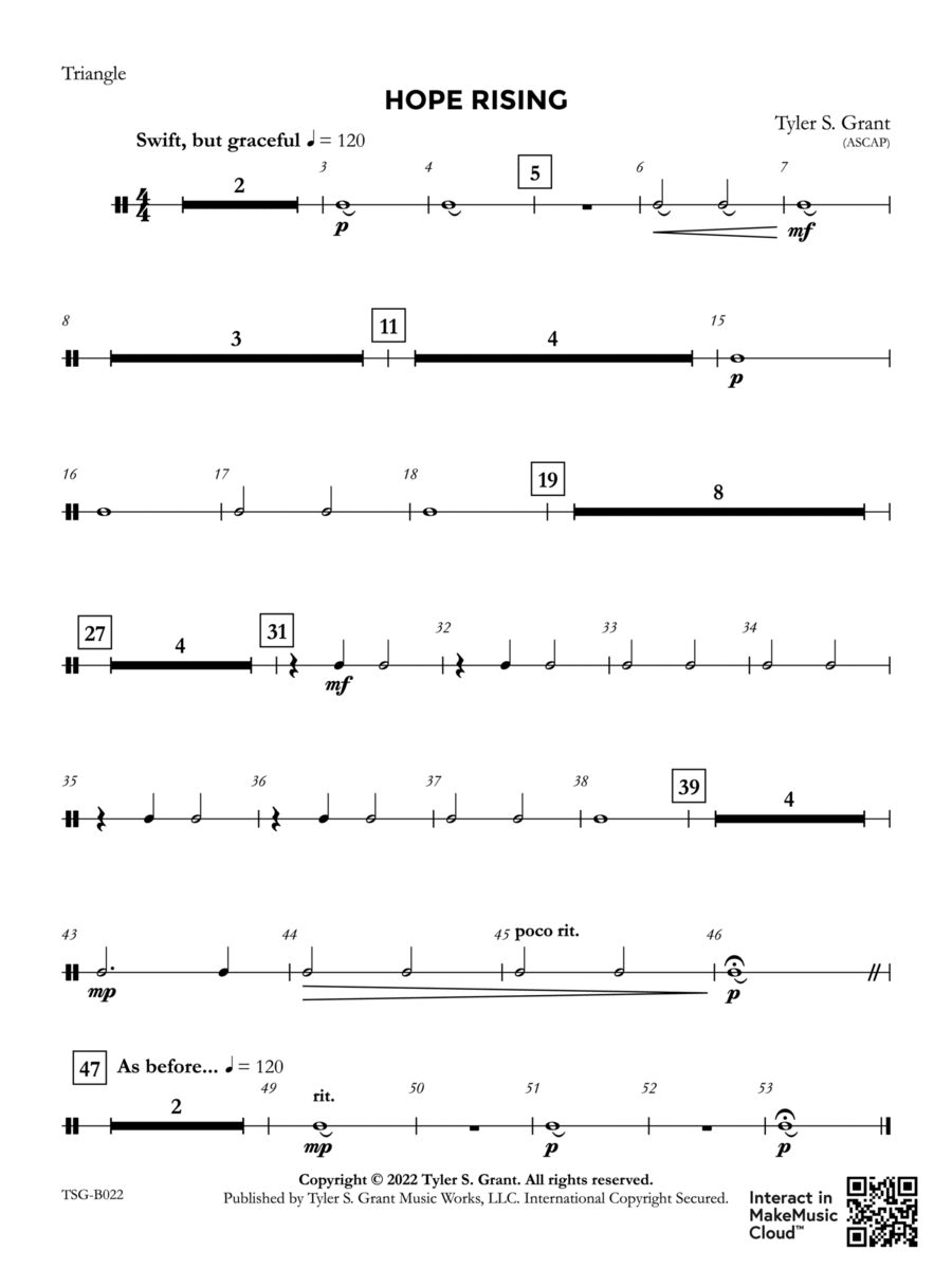 Concert Band - Level 2 - Digital Download SKU: A0.1042624 Composed by Mary Rounsavall. 20th Century,Contemporary,Contest,Festival,Instructional,Traditional. Score and parts. 2 pages. Mary Rounsavall #647399. Published by Mary Rounsavall (A0.1042624). Additional part for triangle for the Concert Band arrangement of Jarres Terres Deux by Mary Rounsavall.