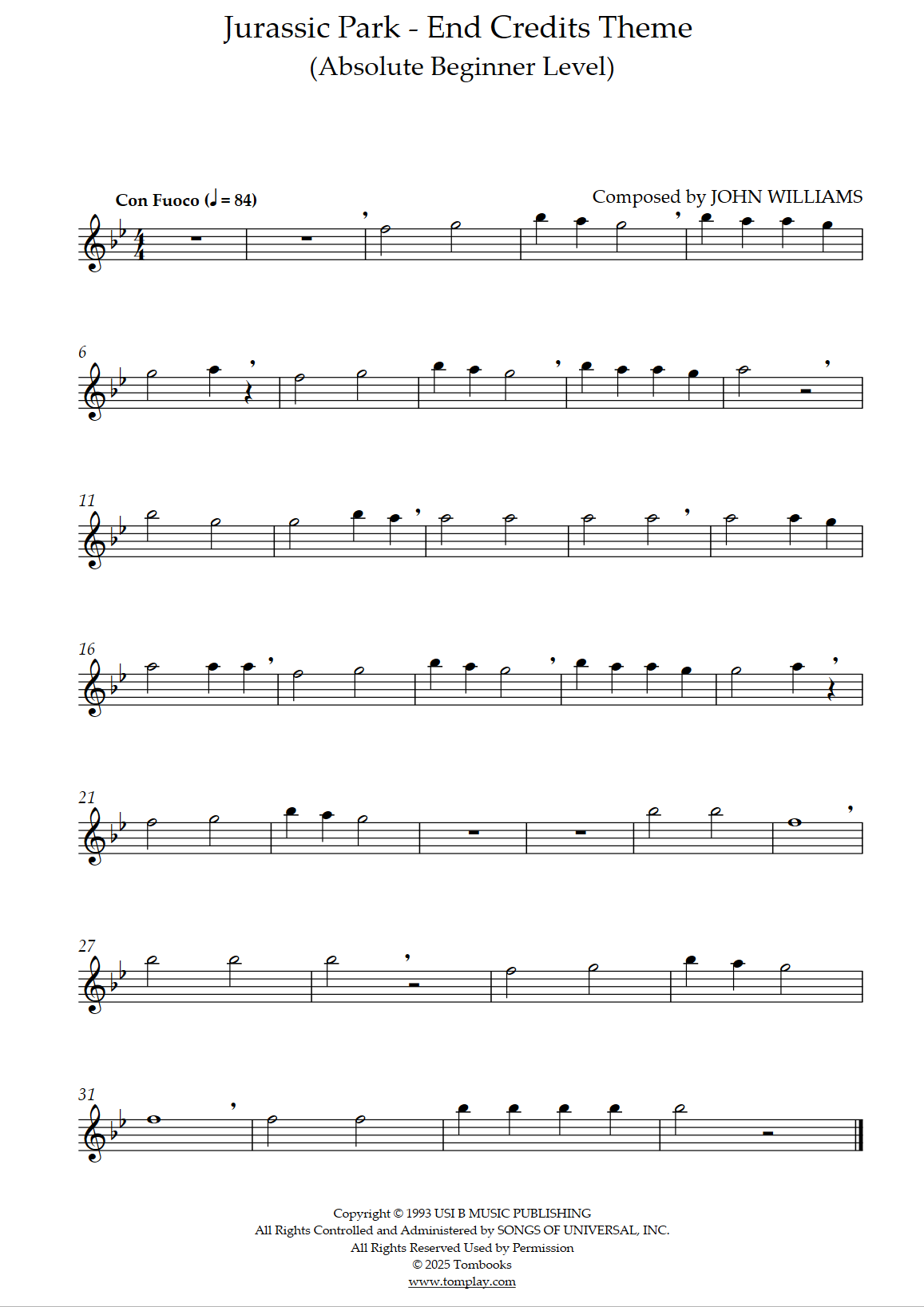 John Williams : Jurassic Park - Thème End Credits (niveau débutant absolu)