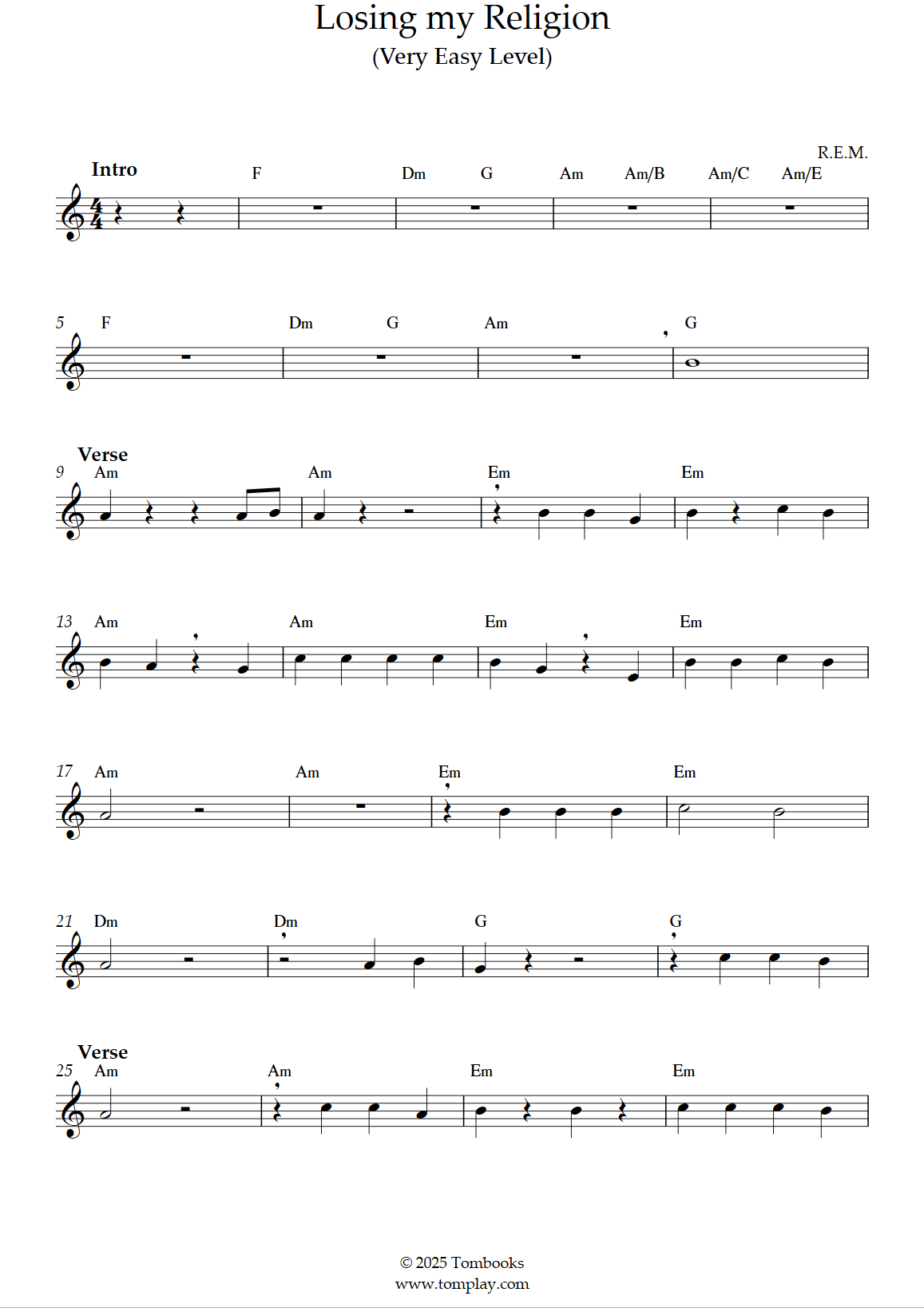 Téléchargez la partition Flûte Losing my Religion (niveau très facile) de R.E.M.. Partitio…