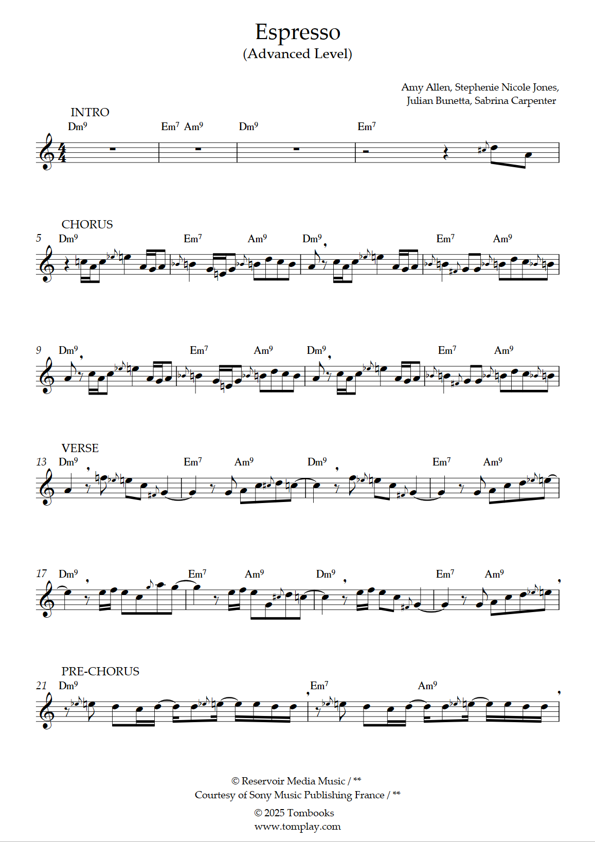 Flute Solo - Level 2 - Digital Download SKU: A0.1462492 By Sabrina Carpenter. By Amy Allen, Julian Bunetta, Sabrina Carpenter, and Stephenie Jones. Arranged by Leo Silva. Pop. Individual part. 3 pages. MP Sheet Music #1041252. Published by MP Sheet Music (A0.1462492). Espresso is a song by American singer Sabrina Carpenter, recorded for her upcoming sixth studio album Short n' Sweet (2024). Carpenter wrote the song together with Amy Allen, Steph Jones and Julian Bunetta, and it was produced by the latter. The track was released as a single on April 11, 2024, through Island Records. A Dave Meyers-directed music video for Espresso was released the following day.And I Love Her is a song originally recorded by the British band The Beatles for the album A Hard Day's Night, released in 1964 as the soundtrack to the film A Hard Day's Night. Composed by singer and bassist Paul McCartney for his then-girlfriend Jane Asher, it was one of the biggest hits for the Beatles, as well as for McCartney, who remembers the song to this day in his performances.The song has been covered by several artists over the years, such as Bob Marley, Sarah Vaughan, Julio Iglesias and Diana Krall. In 1970, Brazilian singer Rita Lee recorded a psychedelic version of the song for her first solo album Build Up.