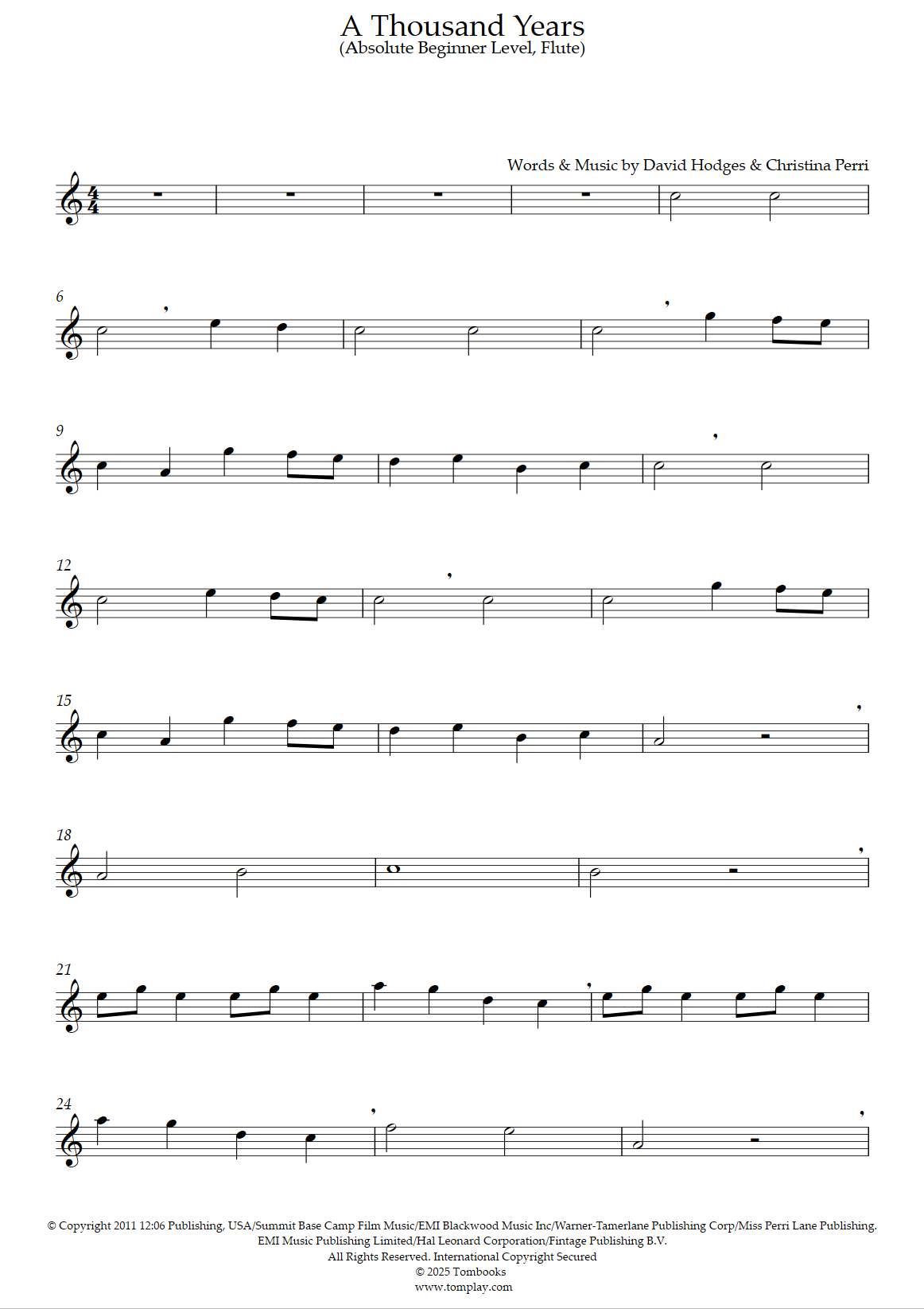 Flute Solo - Level 1 - Digital Download SKU: A0.949764 By Christina Perri. By Christina Perri and David Hodges. Arranged by Henrique F Mangoni. Pop. Individual part. 3 pages. Henrique Franke Mangoni #6745211. Published by Henrique Franke Mangoni (A0.949764). A Thousand Years by Christina Perri. Arranged for solo flute. Perfect for beginners!______________________________________________________Follow me on instagram to know more about my work! (@hfmusica)______________________________________________________christina perri, a thousand years, pop song score, pop song arrangement, a thousand years easy arrangement, a thousand years score, a thousand years flute, christina perri flute,flute arrangement of pop song, twilight, the twilight saga, twilight soundtrack.
