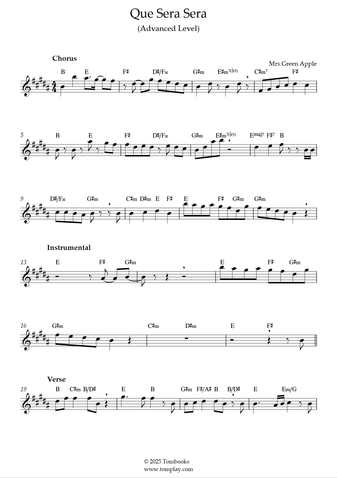 Téléchargez la partition Trompette Que Sera Sera (niveau difficile) de Mrs. Green Apple. P…