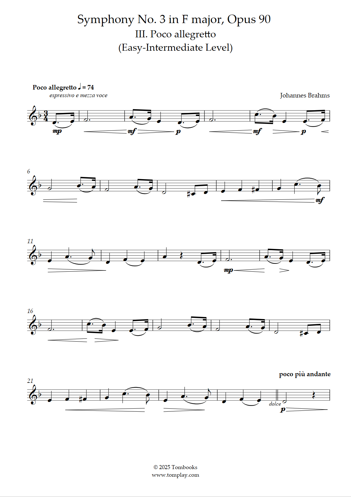 Brahms : Symphonie n° 3 en fa majeur, Opus 90 - III. Poco allegretto (niveau facile/intermédiaire)