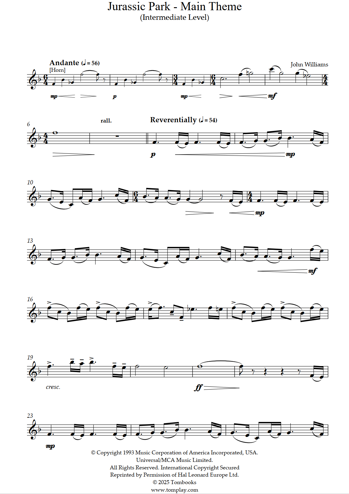 John Williams : Jurassic Park - Thème End Credits (niveau intermédiaire/difficile)