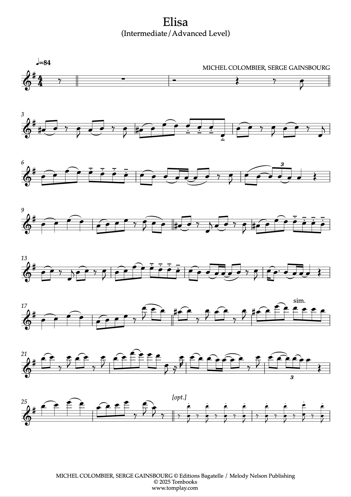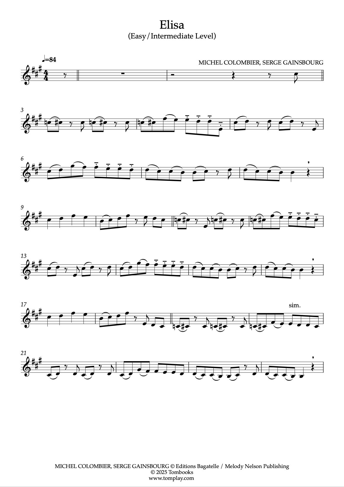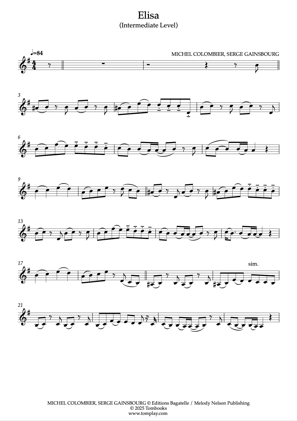 Téléchargez la partition Violon Elisa (niveau intermédiaire/difficile) de Serge Gainsbourg…