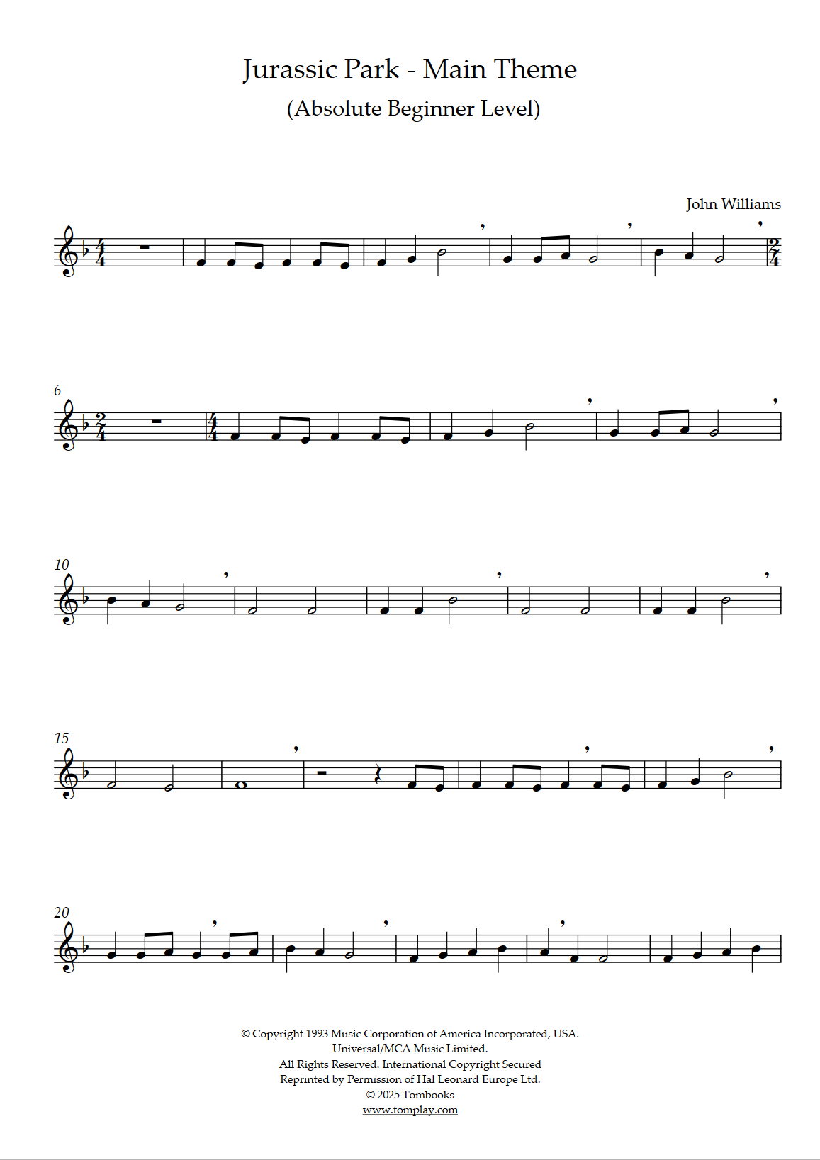 John Williams : Jurassic Park - Thème principal (niveau débutant absolu)
